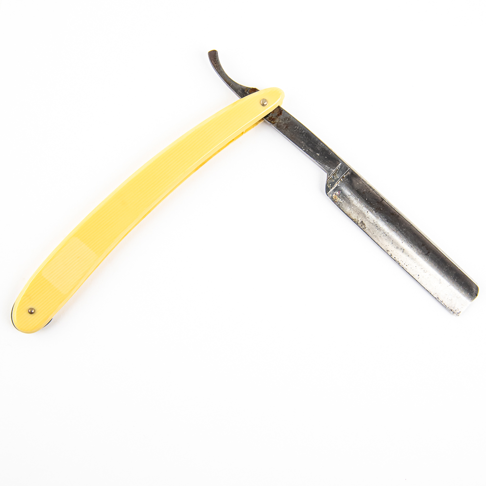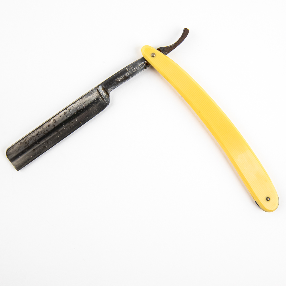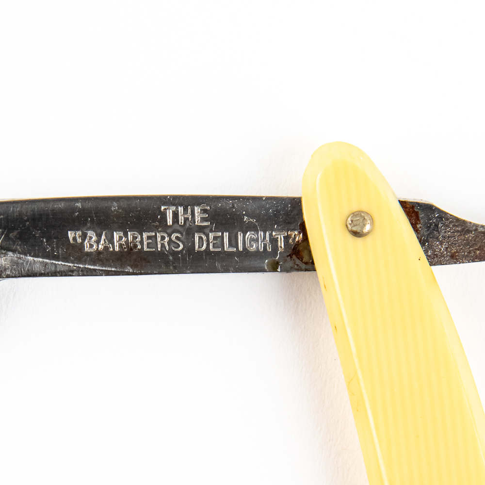 Vintage Straight Razor “The ‘Barbers Delight’ ” by Unknown Mfg. Has off-white/yellowed celluloid scales. The face is blank, Tang reads “The ‘Barbers Delight’ “, and reverse is blank. Has a square/french point blade, which is in overall great condition, with light tarnish noted. Original Box NOT included. See photos and bid accordingly.