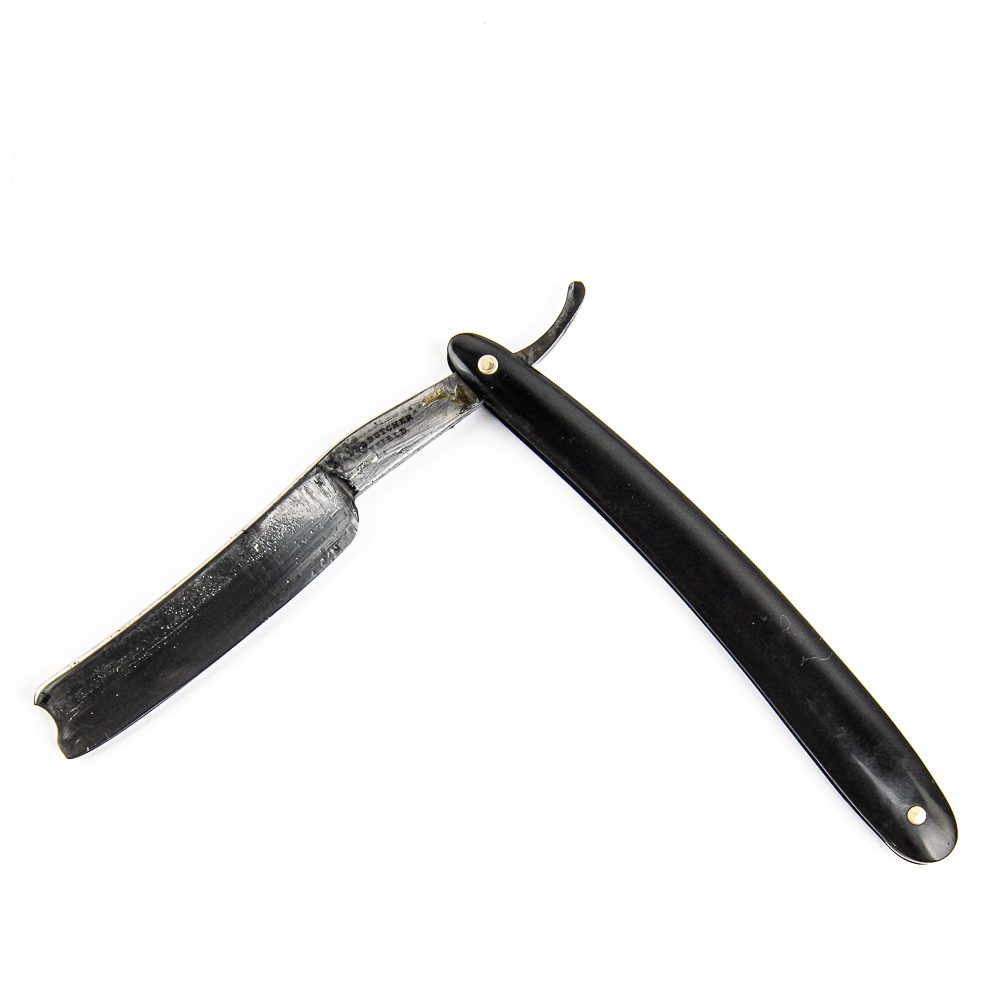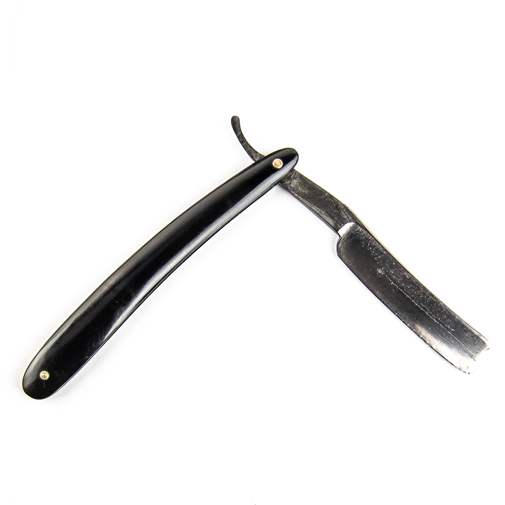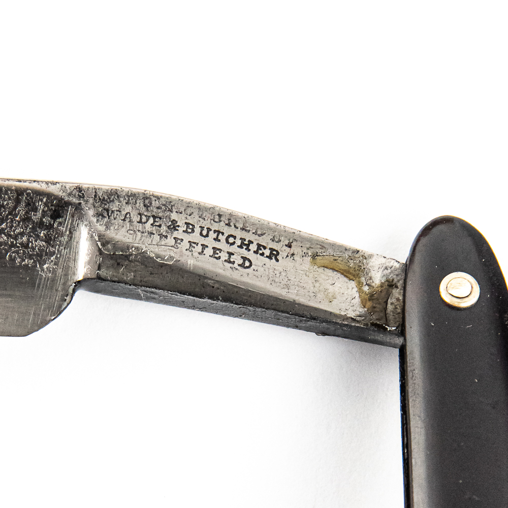Vintage Straight Razor by Wade & Butcher, with black plastic scales. The face is blank, Tang reads “Wade & Butcher Sheffield”, and reverse is blank. Blade is in overall pristine condition, with nice luster and minimal tarnish, has cosmoline protectant applied. Original Box NOT included. See photos and bid accordingly.