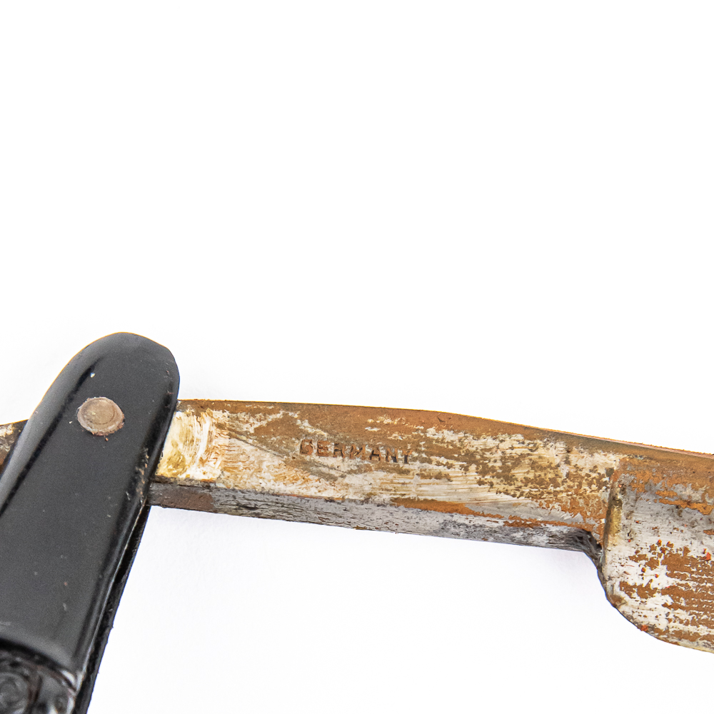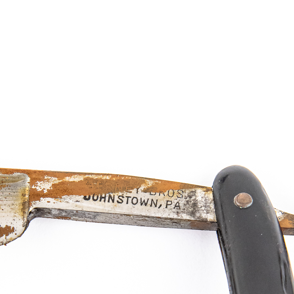 Vintage Straight Razor by Berney Bros. Has black plastic bamboo-styled scales with a blank face. Tang reads “Berney Bros Johnstown, PA” and reverse reads “Germany”. Has a square point blade, which is in overall fair condition with moderate tarnish and light surface rust noted. Original Box NOT included. See photos and bid accordingly.