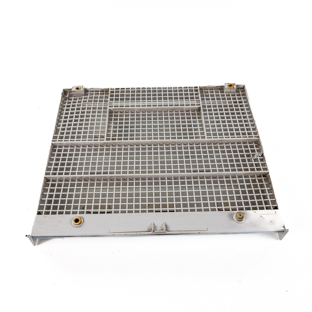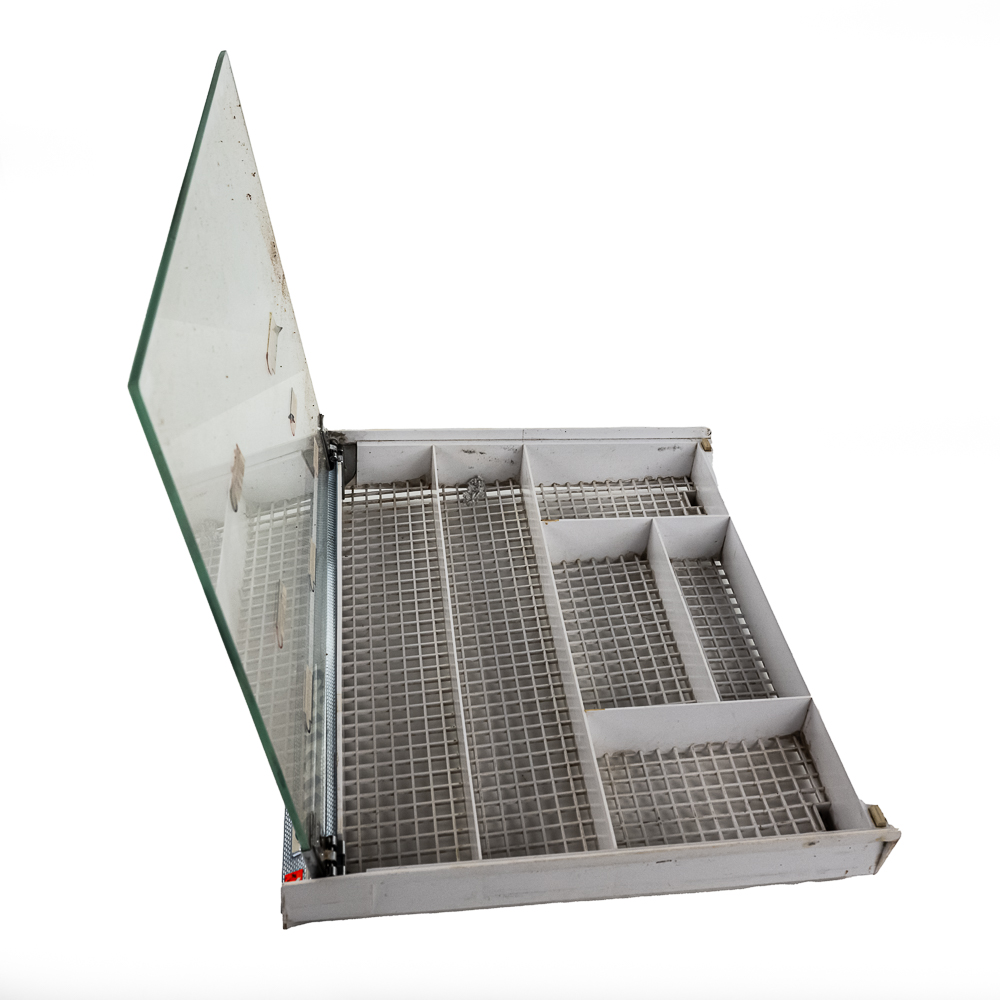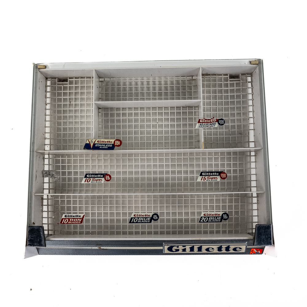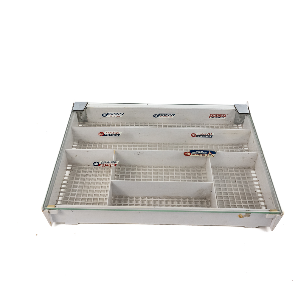 Vintage Gillette Razor showcase, in fair condition. Has white base with a grid-style bottom, with glass top. Glass top exhibits heavy scratches from use and storage, and has multiple Gillette pricing stickers attached. Measures approx. 17″ L x 14″ W x 2.5″ H. See photos and bid accordingly.