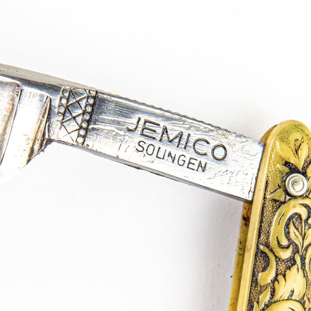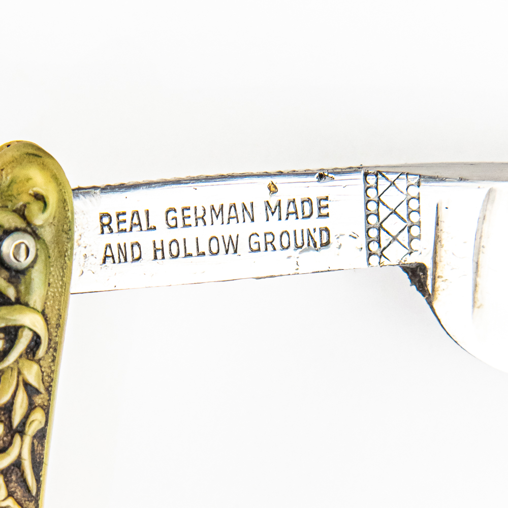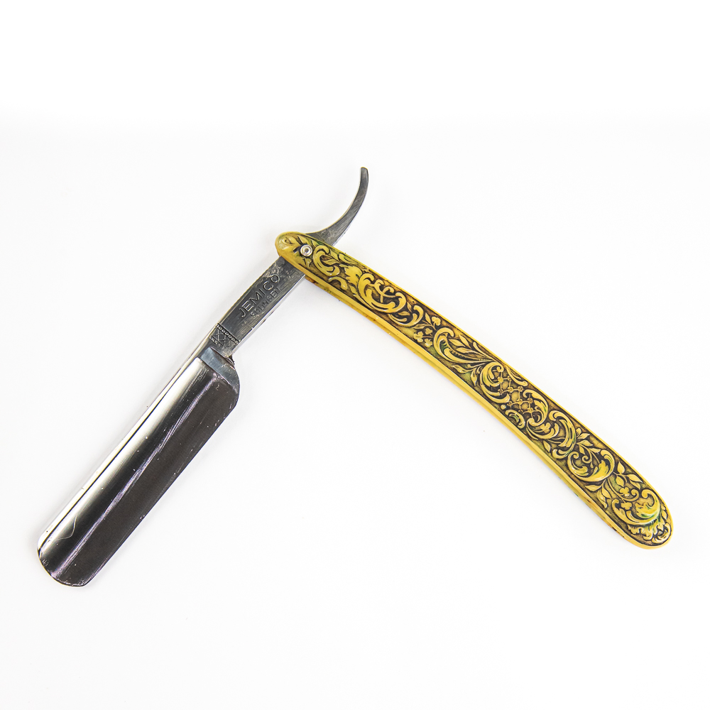 Vintage Straight Razor “Jemico”, with yellowed/black celluloid scales with floral patterns embossed. The face is blank, Tang reads “Jemico Solingen”, and reverse reads “Real German Made and Hollow Ground”. Blade is in overall pristine condition, with beautiful luster, has cosmoline protectant applied. Unoriginal box IS included, reads “Kinfolks Inc.” and is in fair condition. See photos and bid accordingly.