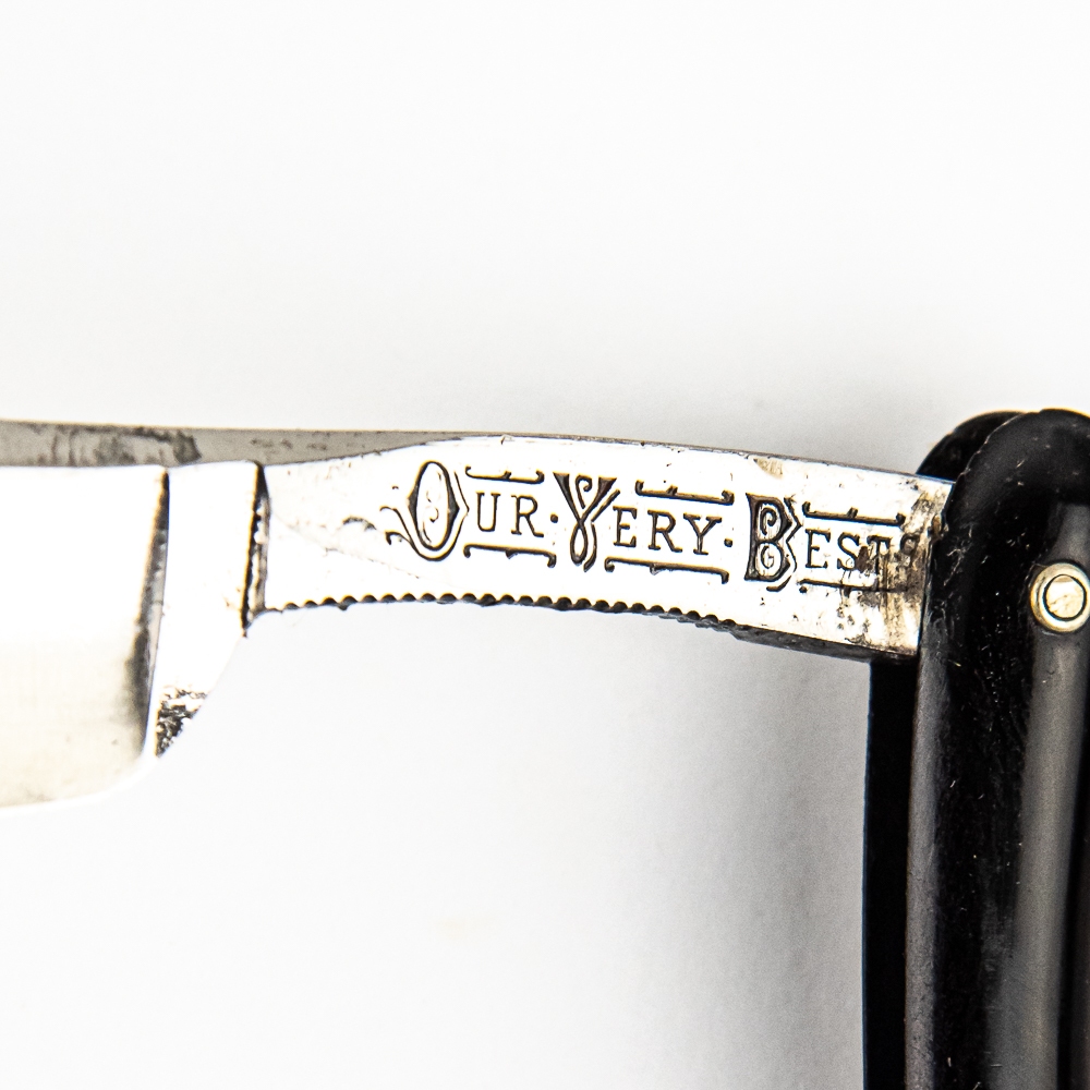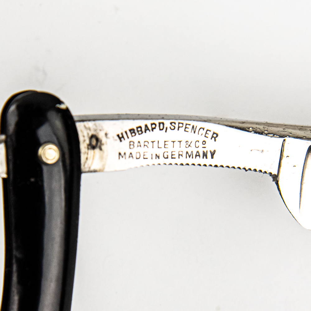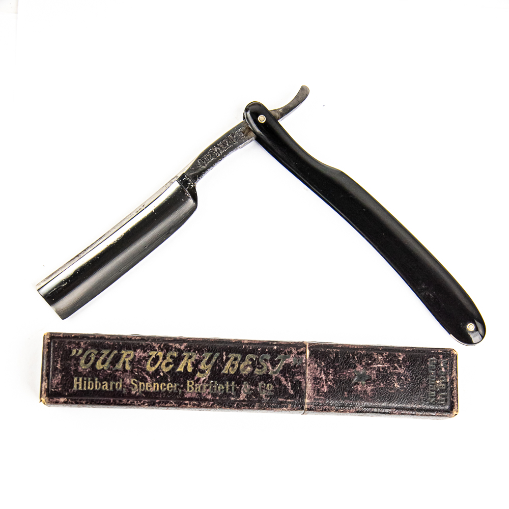 Vintage Straight Razor “Our Very Best” by Hibbard, SPencer, Bartlett & Co, with black plastic scales, somewhat unique design slightly different shape. The face is blank, Tang reads “Our Very Best”, and reverse reads “Hibbard, Spencer Bartlett & Co Made in Germany” with a “0”. Blade is in overall pristine condition, with beautiful luster, has cosmoline protectant applied. Original Box IS included and is in fair condition. See photos and bid accordingly.