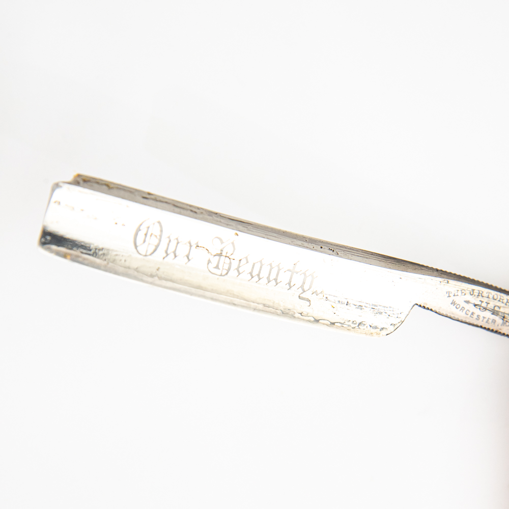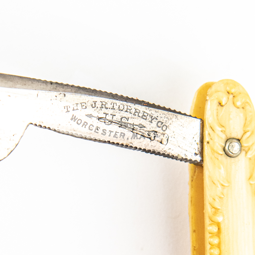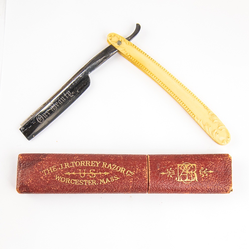 Vintage Straight Razor by J. R. Torrey Razor Co, with off-white celluloid scales with embossed beads on edges and wavy designs near pins. The face reads “Our Beauty” and tang reads “The J.R. Torrey Co Worcester, Mass” with “US” and arrow, and reverse is blank. Blade is in overall great condition, with really nice luster, has cosmoline protectant applied. Original Box IS included and is in good condition. See photos and bid accordingly.