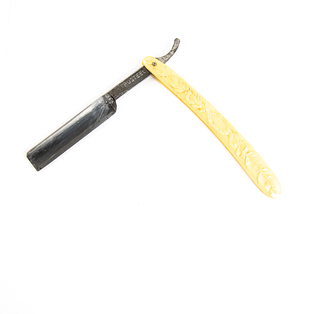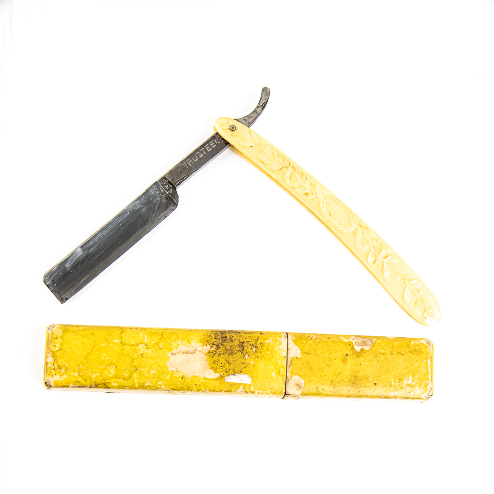 Vintage Straight Razor “Trusteel” , with off-white celluloid scales with embossed vines. The face is blank, Tang reads “TRUSTEEL”, and reverse is blank. Blade is in overall pristine condition, with great luster, minimal tarnish, and has cosmoline protectant applied. Unoriginal Box IS included, mo markings or identification, and is in fair condition. See photos and bid accordingly.