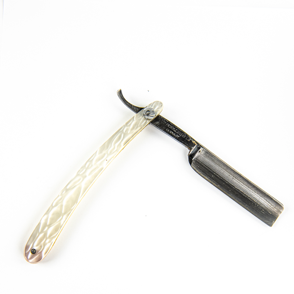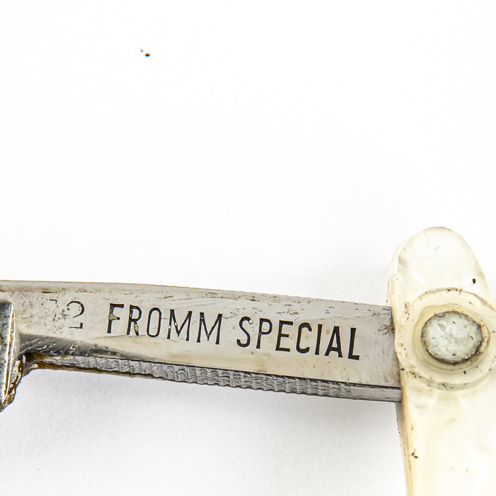 Vintage Straight Razor “Fromm Special” by Otto Fromm Cutlery Co, with pearly celluloid scales, with a logo of some sort pressed into side, faintly. The face is blank, Tang reads “Fromm Special”, and reverse reads “Otto Fromm Cutlery Co. Germany” Blade is in overall great condition, with nice luster, has cosmoline protectant applied. Unoriginal box IS included, reads “Special Quality Fully Warranted” and is in fair condition. See photos and bid accordingly.