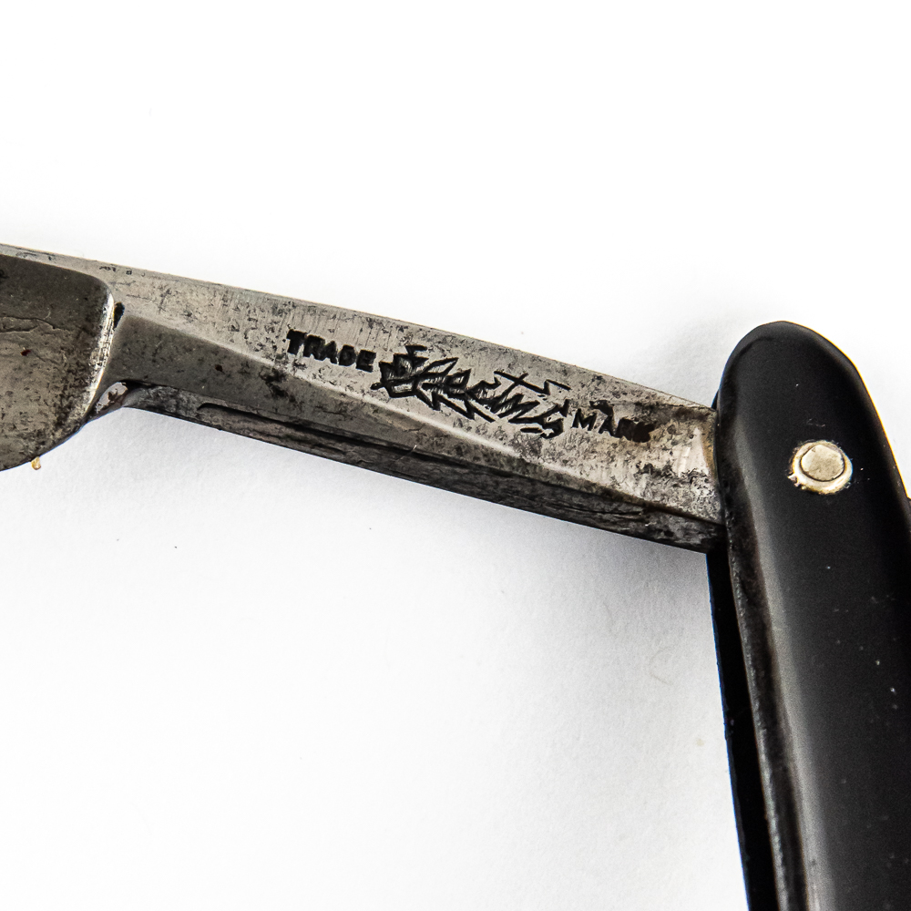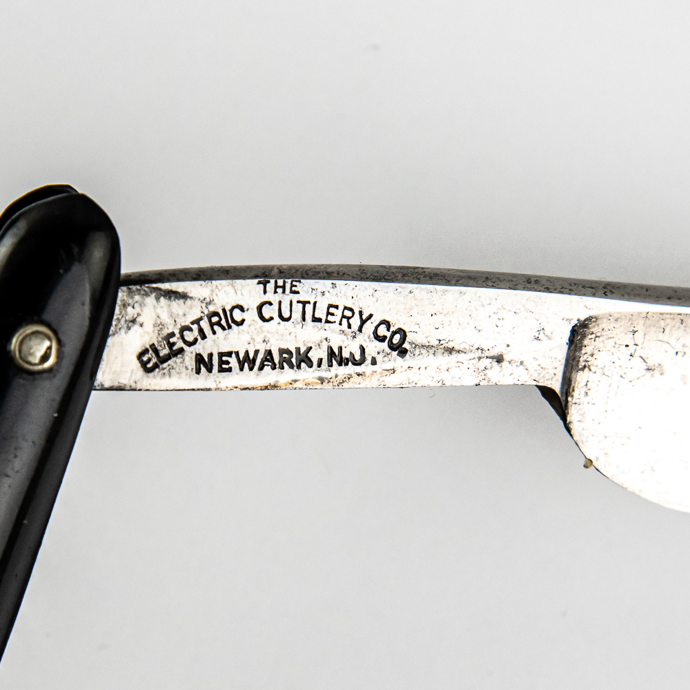Vintage Straight Razor by The Electric Cutlery Co, with black plastic scales. The face is blank, Tang reads “Electric Trademark”, and reverse reads “The Electric Cutlery Co Newark, N.J”. Blade is in overall great condition, with nice luster, has cosmoline protectant applied. Unoriginal box IS included, has faint markings that are unreadable, and is in fair condition. See photos and bid accordingly.