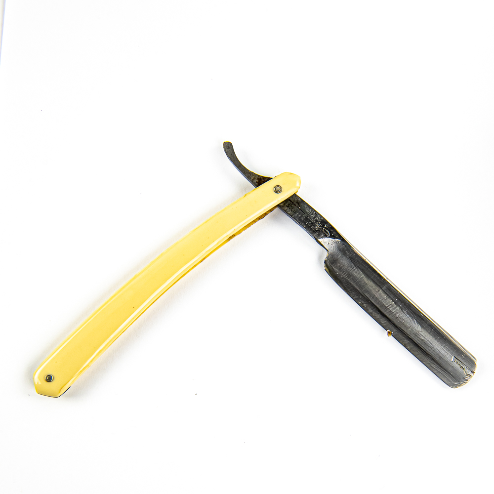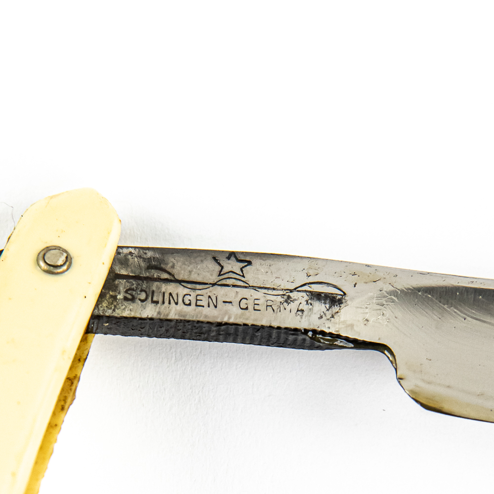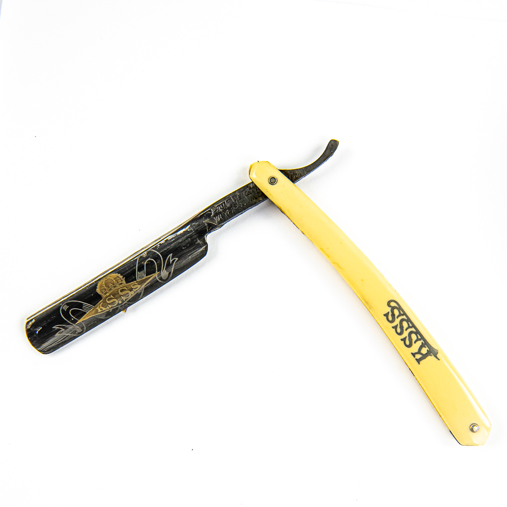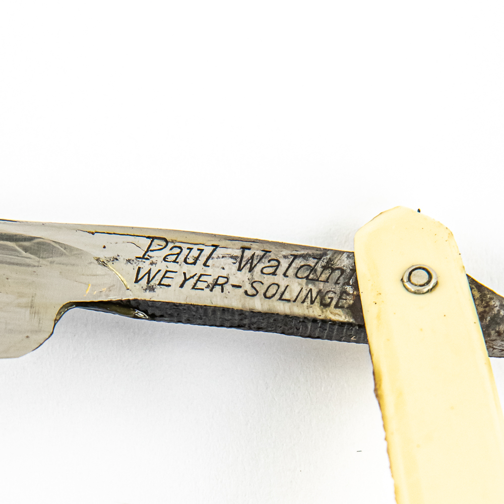 Vintage Straight Razor “KSSS” by Paul Waldmin Solingen, with off-white celluloid scales, with metal “KSSS” pressed into center. The face reads “K.S.S.S” with crown, Tang reads “Paul Waldmin Weyer-Solingen”, and reverse reads “Solingen Germany” with star. Blade is in overall pristine condition, with beautiful luster, does exhibit light tarnish near tang/pivot pin, has cosmoline protectant applied. Original box IS included and is in rough condition. See photos and bid accordingly.