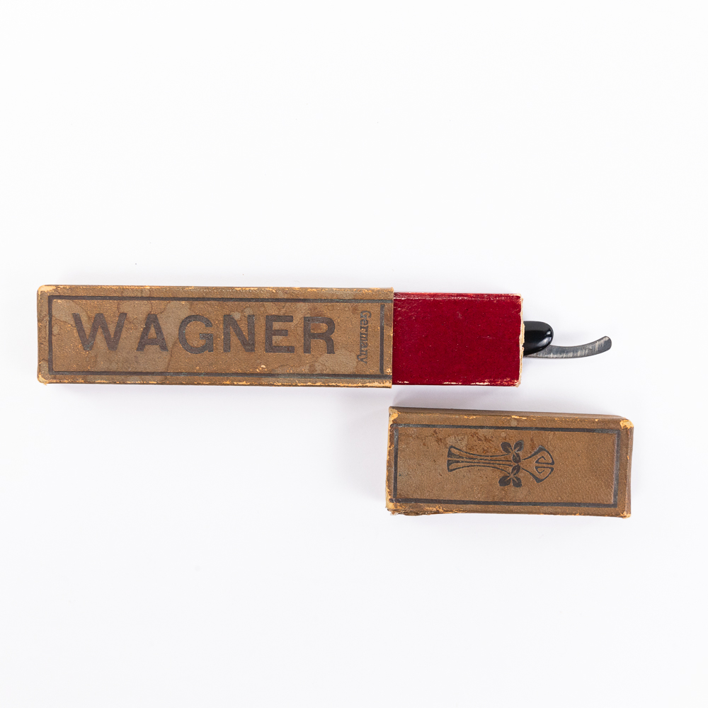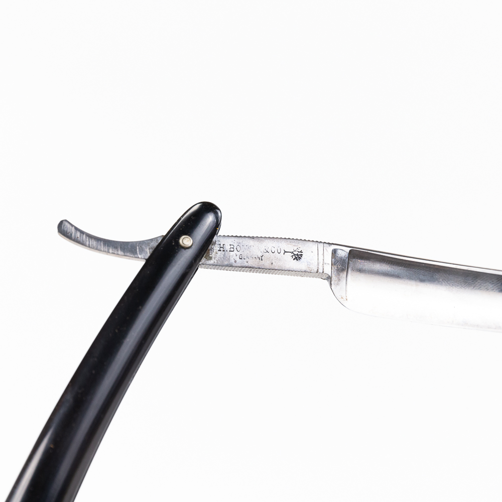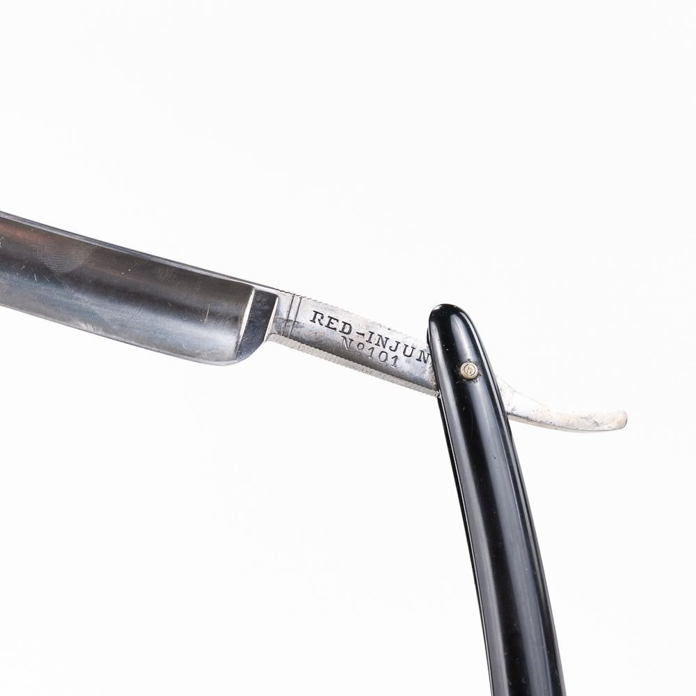 Vintage Straight Razor “Red Injun No. 101” by H. Boker & Co, with black plastic scales. The face is blank, Tang reads “Red Injun No 101”, and reverse reads “H. Boker & Co Germany” w/ tree logo. Blade is in overall great condition, and with nice luster. Unoriginal box IS included, reads “Wagner” and is in fair condition. See photos and bid accordingly.