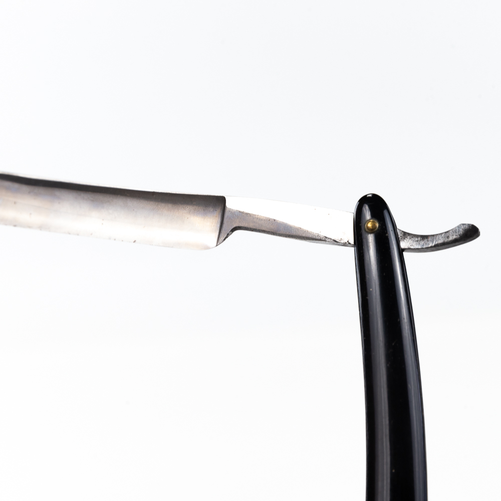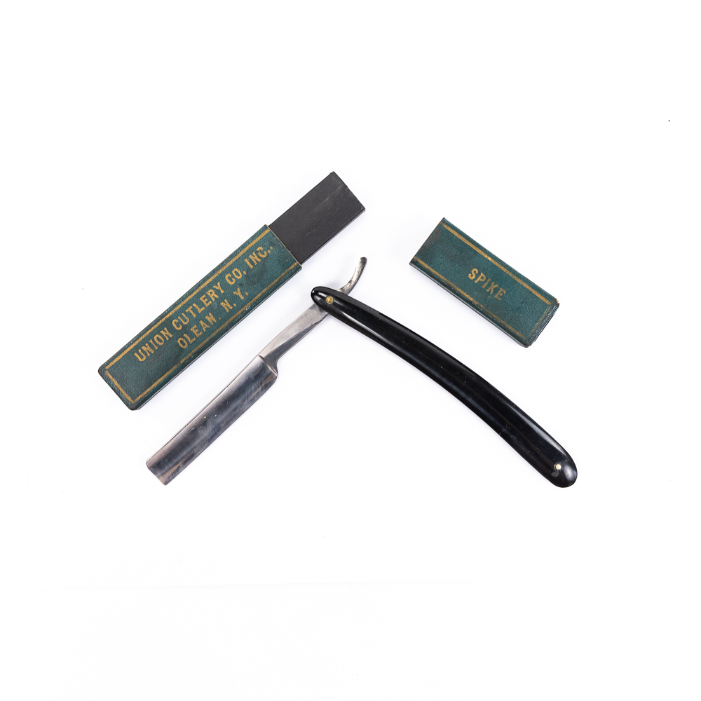 Vintage Straight Razor, with black plastic scales. Razor has no markings or identification anywhere. Blade is in overall great condition, with really nice luster. Unoriginal box IS included, reads “Union Cutlery Co Inc” with “Spike” on cap, and is in good condition. See photos and bid accordingly.