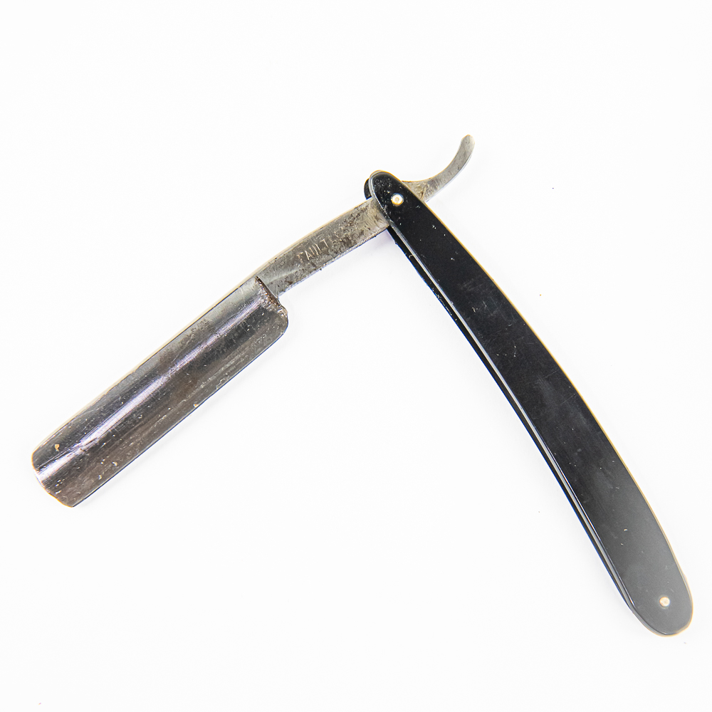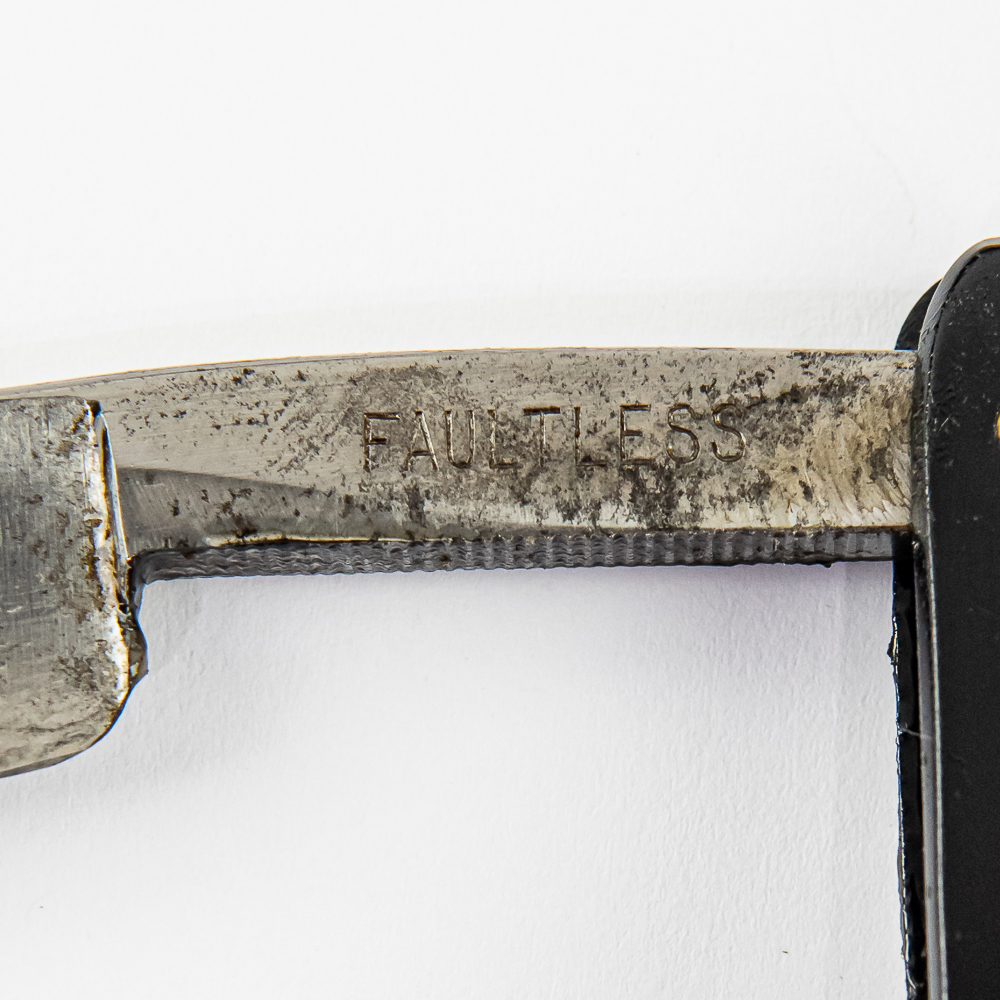 Vintage Straight Razor “Faultless”, with black plastic scales. The face is blank, Tang reads “Faultless”, and reverse is blank. Blade is in overall great condition, with nice luster, and minor tarinsh, and has cosmoline protectant applied. Unoriginal box IS included, reads “Extra Hollow Ground Fully Warranted” and is in rough condition. See photos and bid accordingly.