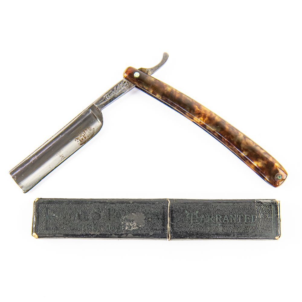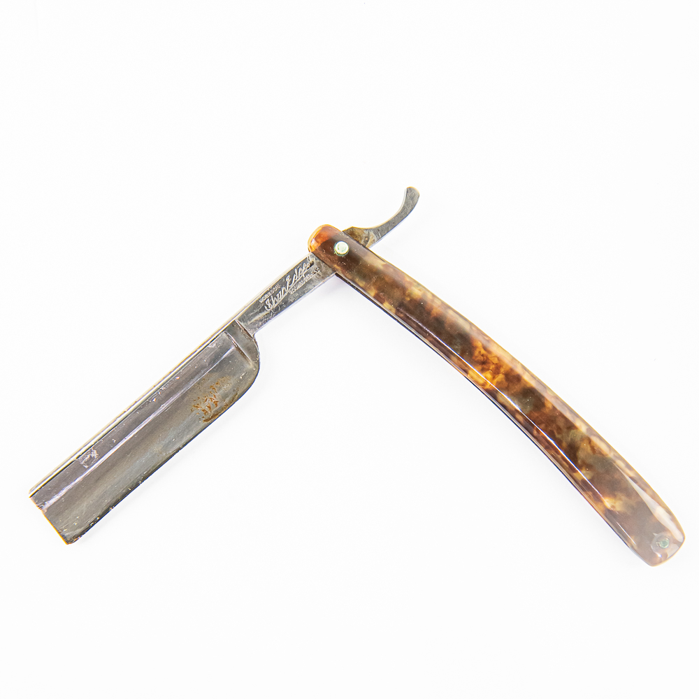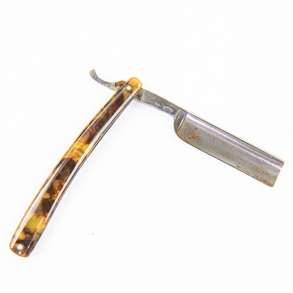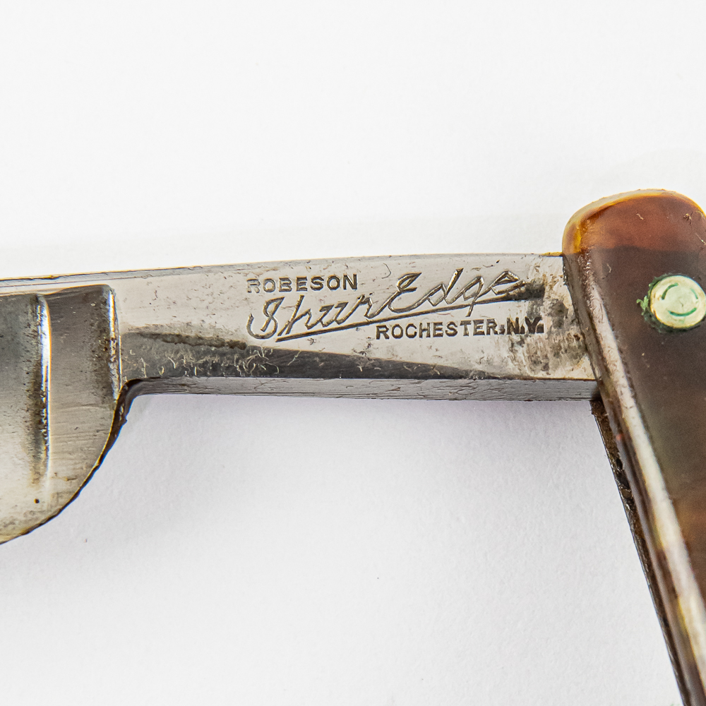 Vintage Straight Razor “ShurEdge” by Robeson, with faux-tortoishell plastic scales. The face is blank, Tang reads “Robeson ShurEdge Rochester NY”, and reverse is blank. Blade is in overall good condition, with nice luster, some surface rust spots and tarnish, and has cosmoline protectant applied. Unoriginal box IS included and is in fair condition. See photos and bid accordingly.