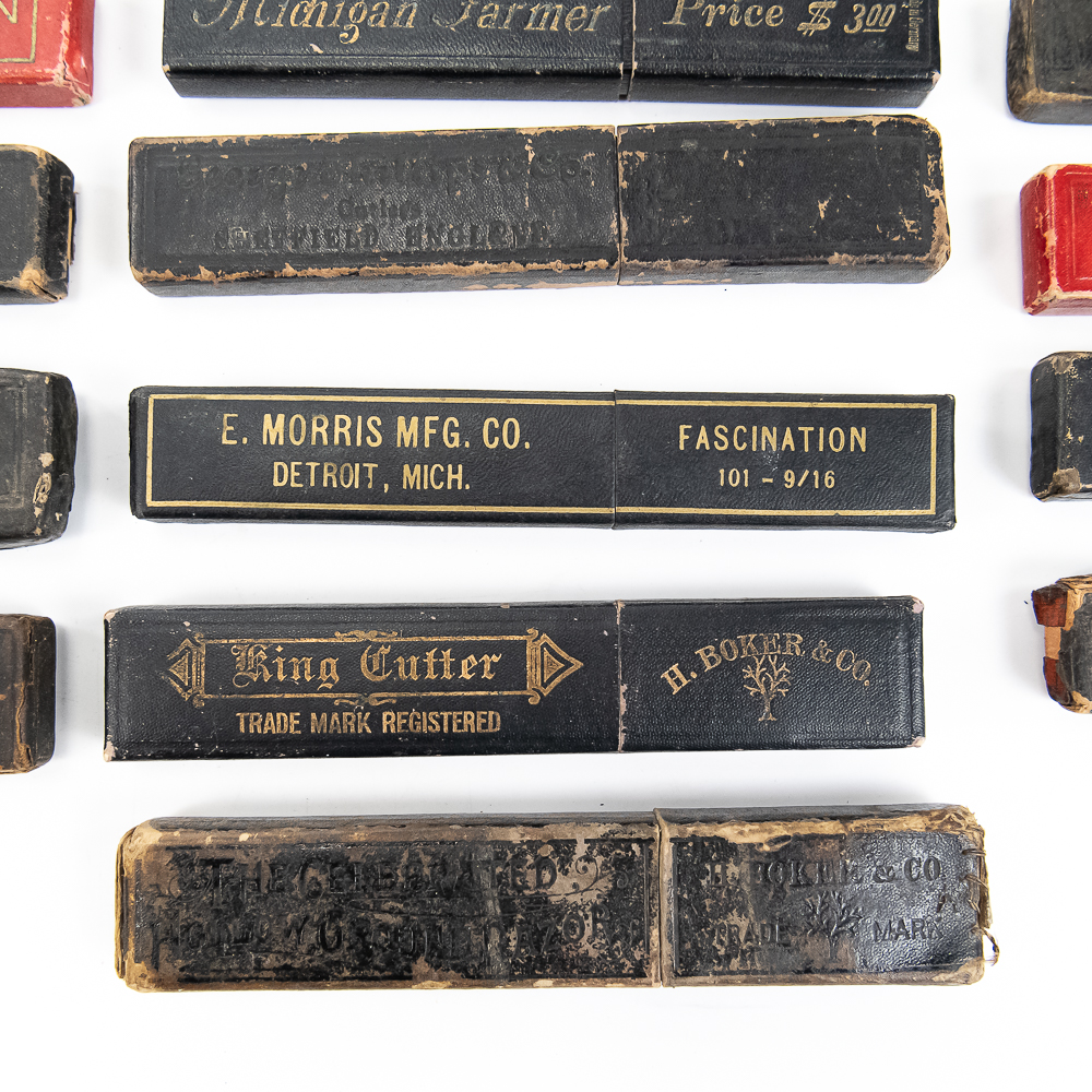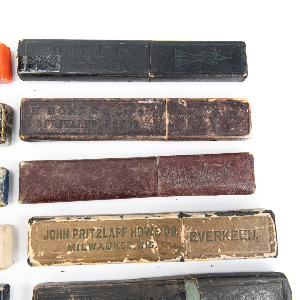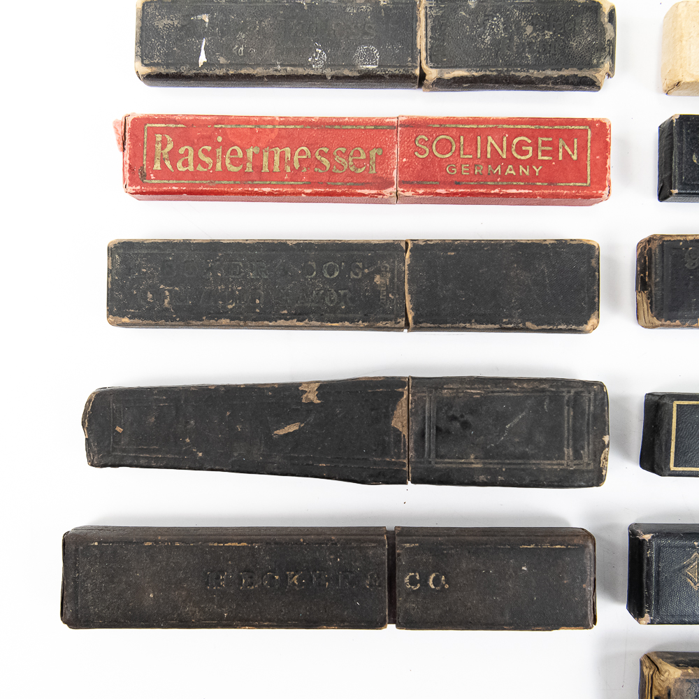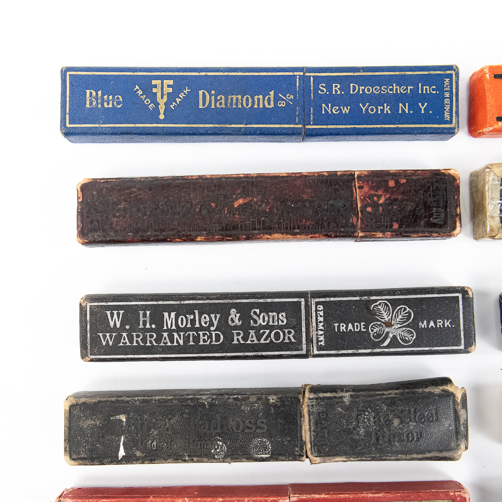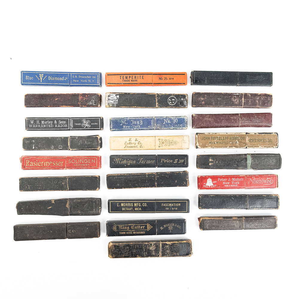 Large lot of miscellaneous Straight Razor boxes, with notable names such as H. Boker & Co, Wade & Butcher, Peter J. Michels, S. R. Droescher Inc, etc. Conditions Vary, see photos and bid accordingly.