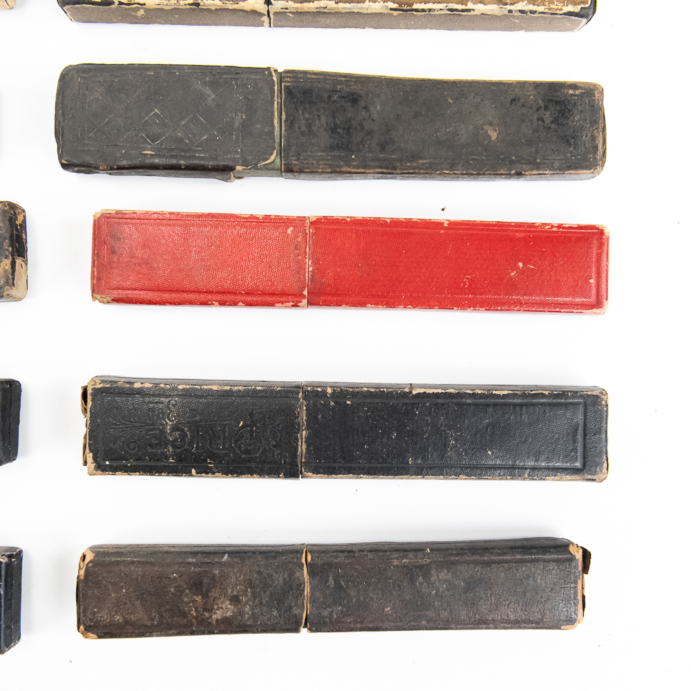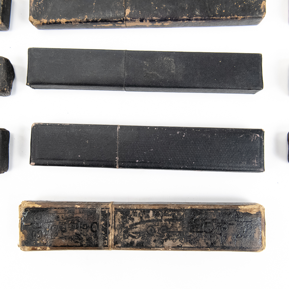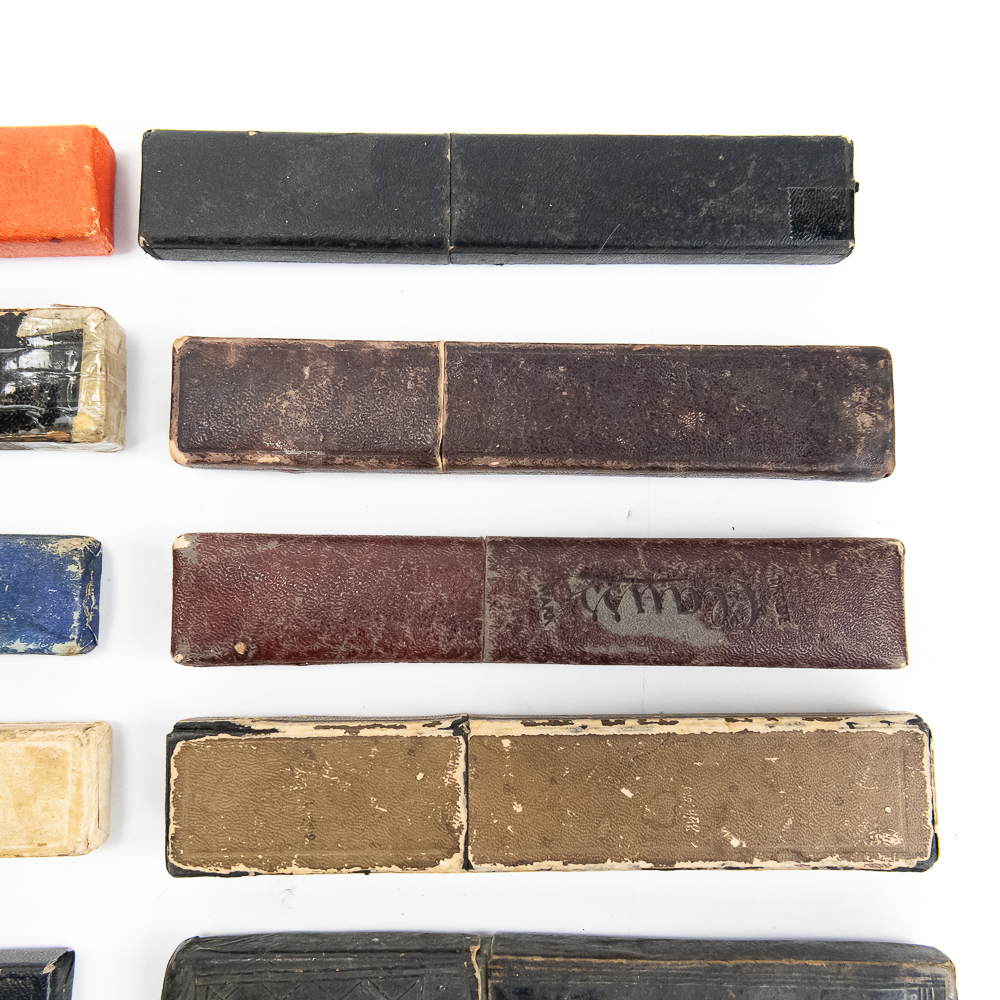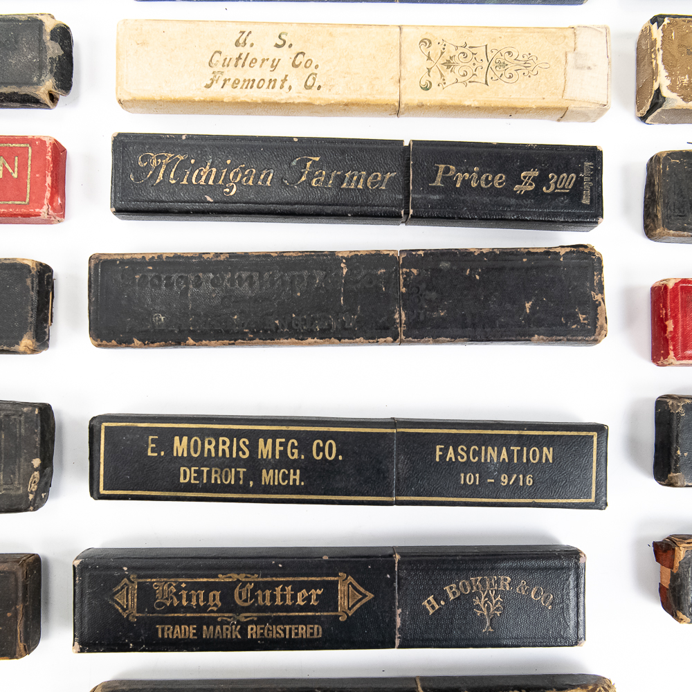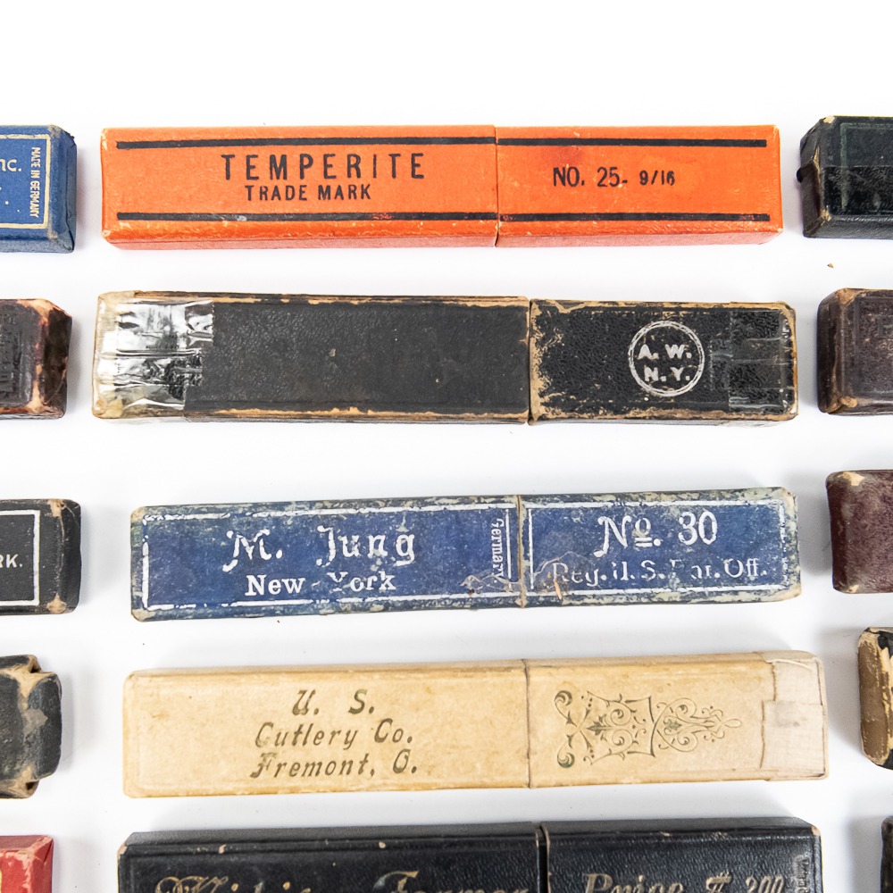 Large lot of miscellaneous Straight Razor boxes, with notable names such as H. Boker & Co, Wade & Butcher, Peter J. Michels, S. R. Droescher Inc, etc. Conditions Vary, see photos and bid accordingly.