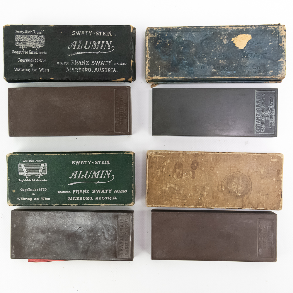 (4) Swaty-Stein Hones, included are (2) Swaty-Stein “Alumin” in original boxes, one with directions, and other two appear to be in their non-original boxes. See photos and bid accordingly.