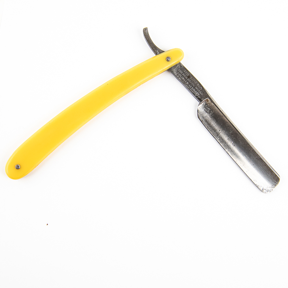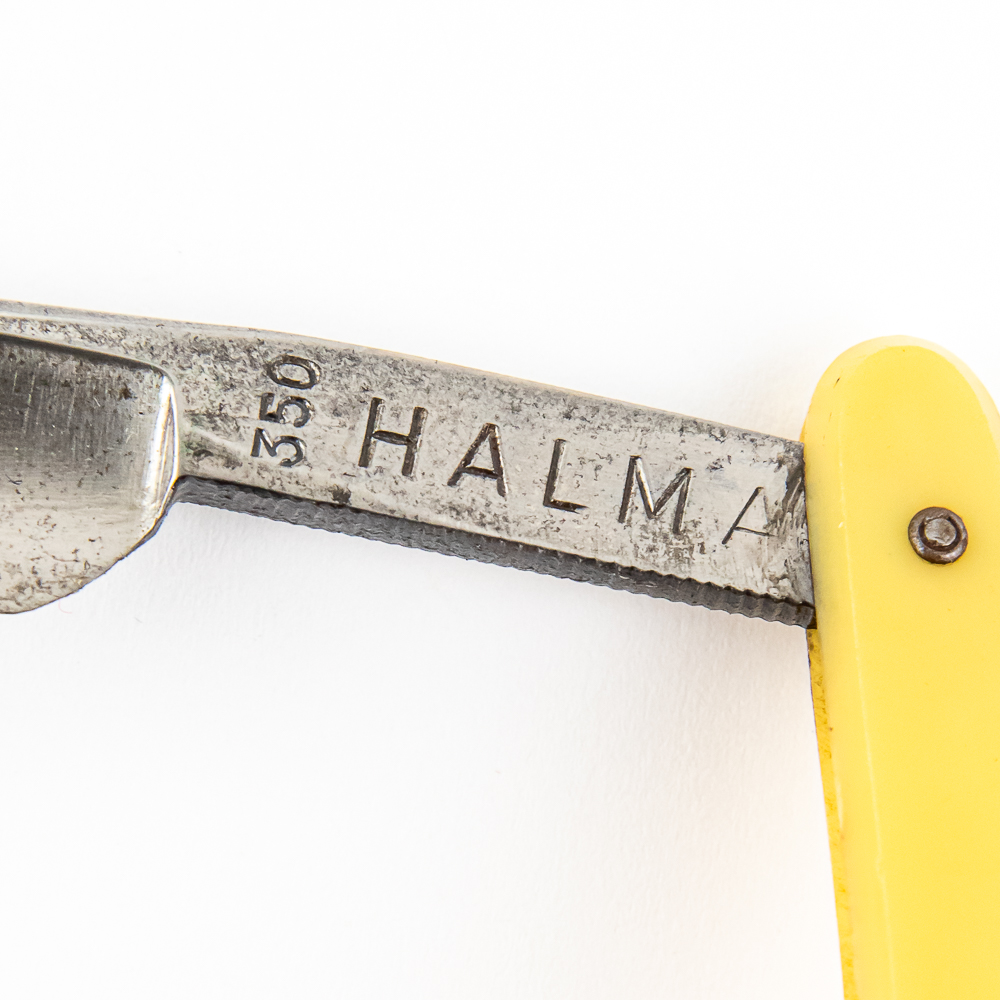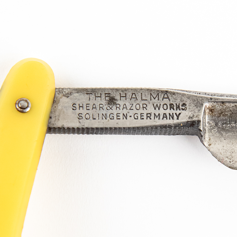 Vintage Straight Razor “Halma 350” by Shear & Razor Works. Has yellowed celluloid scales. The face is blank, Tang reads “Halma” and vertical “350”, and reverse reads “The Halma Shear & Razor Works Solingen-Germany”. Has a round point blade, which is in overall great condition with nice luster, and with very minimal tarnish noted. Original Box NOT included. See photos and bid accordingly.