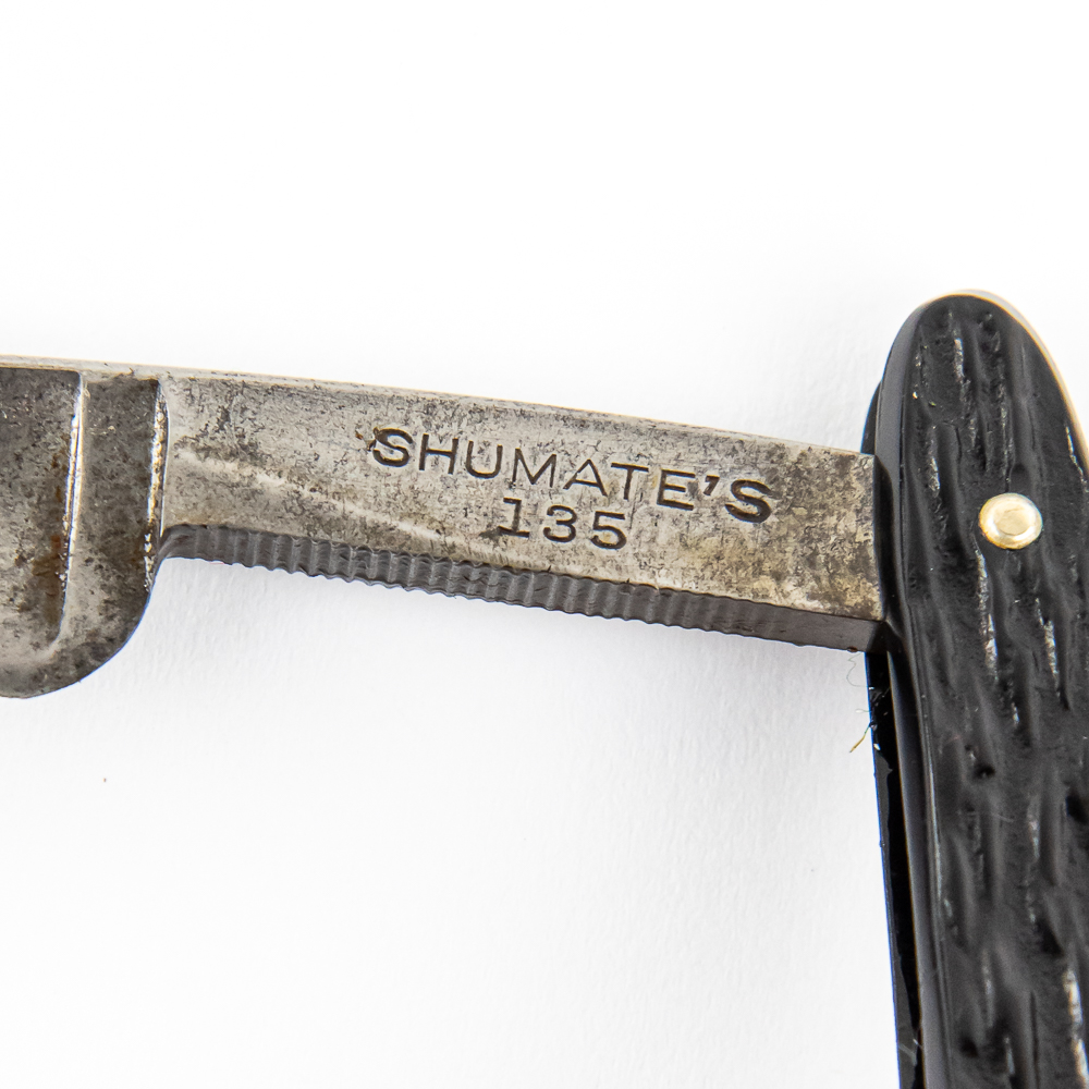 Vintage Straight Razor “135” by Shumate. Has black molded bark-themed scales. The face is blank, Tang reads “Shumate’s 135”, and reverse reads “Shumate Razor Co St. Louis U.S.A.” Has a round point blade, which is in overall fair condition, with moderate tarnish, and minor blade chips noted. Original Box NOT included. See photos and bid accordingly.