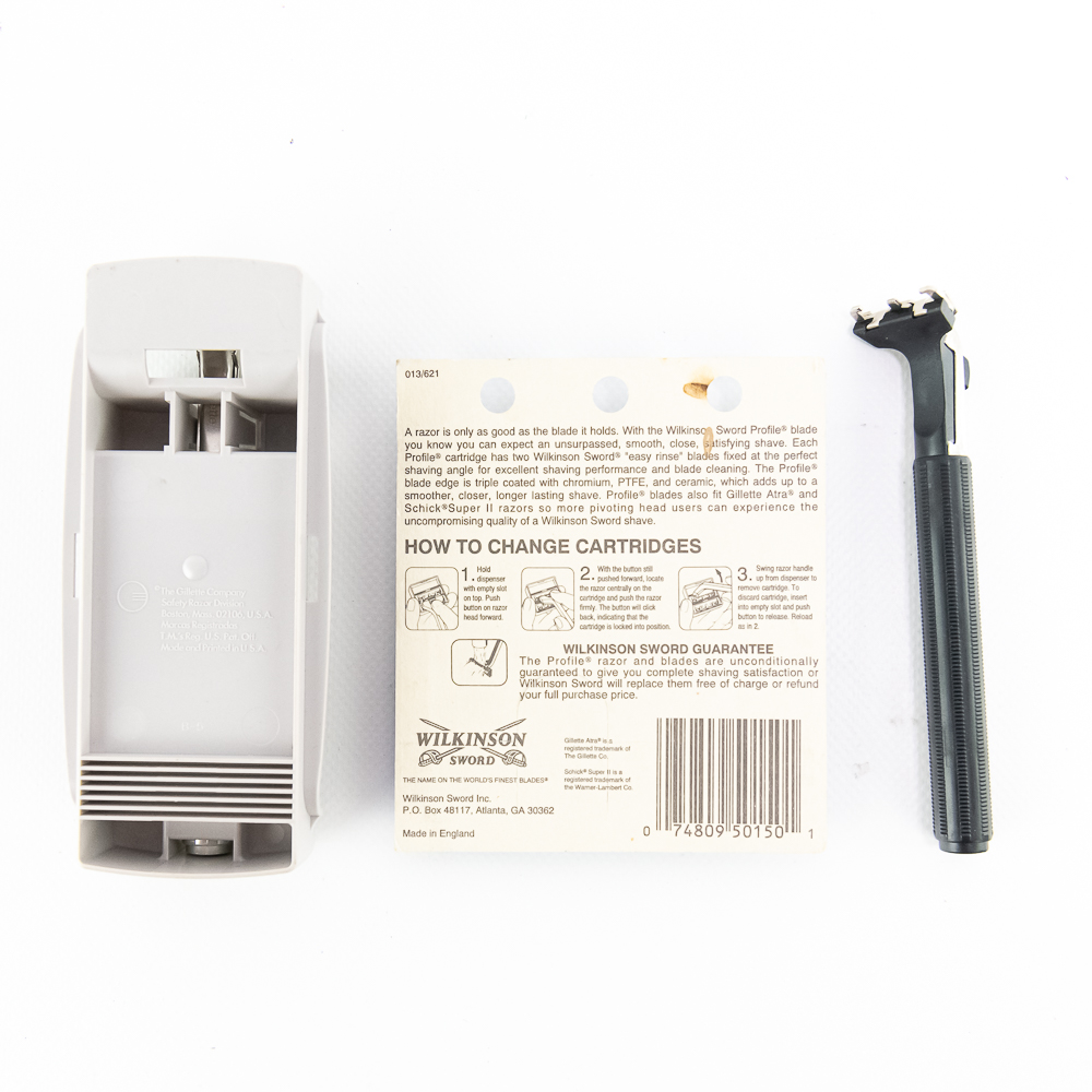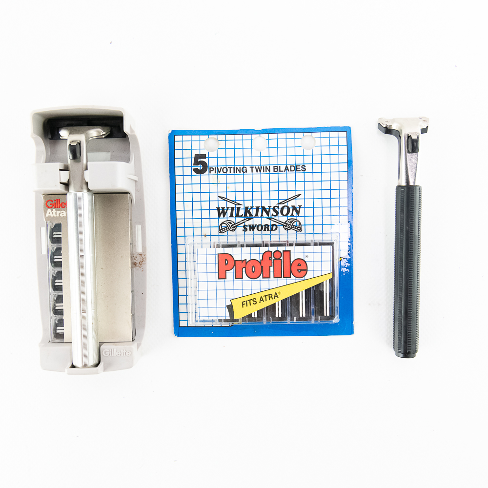(2) Gillette Atra razors, one includes packaging. Also included is a package of 5 Wilkinson Sword Atra blade cartridges. See photos and bid accordingly.