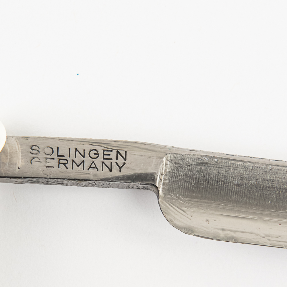 Vintage Straight Razor “Dovo-Extra”, with white plastic scales, with blue “Bergischer Lowe” with crest. The face reads “Dovo-Extra”, Tang reads “Dovo Solingen Made in Germany” w/ logo, and reverse reads “Solingen Germany”. Blade is in overall pristine condition, with beautiful luster, has cosmoline protectant applied. Potentially Original box IS included, is same brand, may not be same model, and is in great condition, with instructions. See photos and bid accordingly.