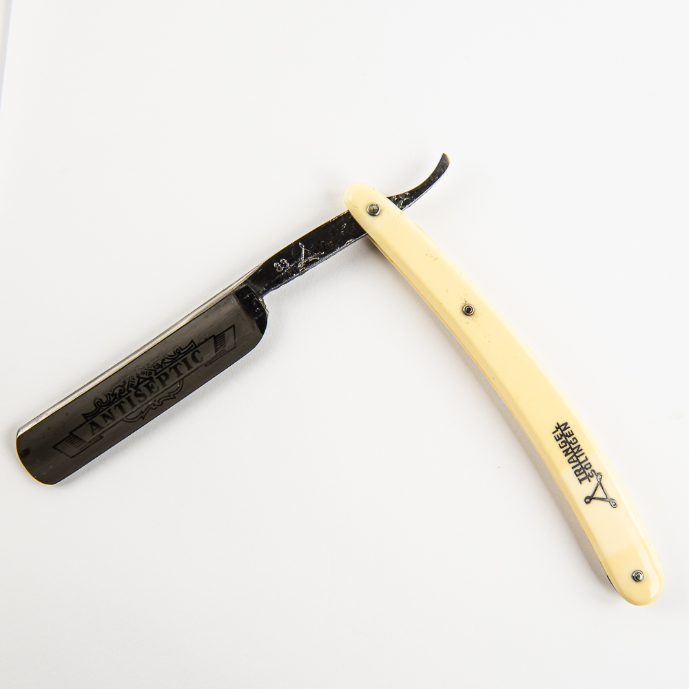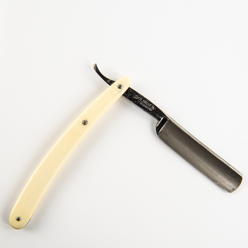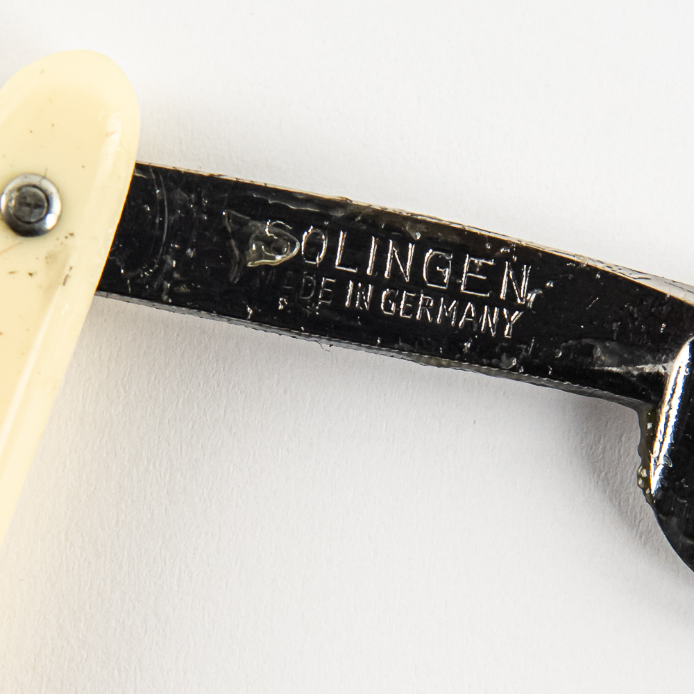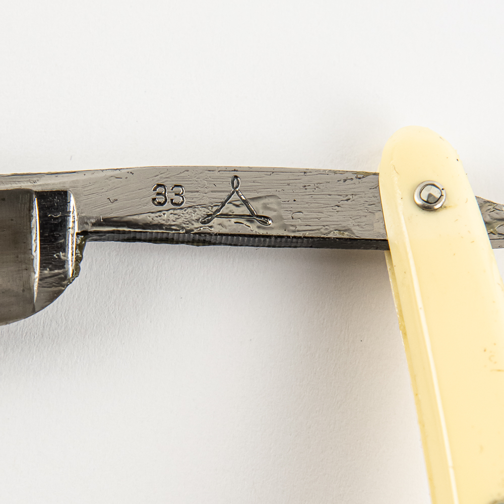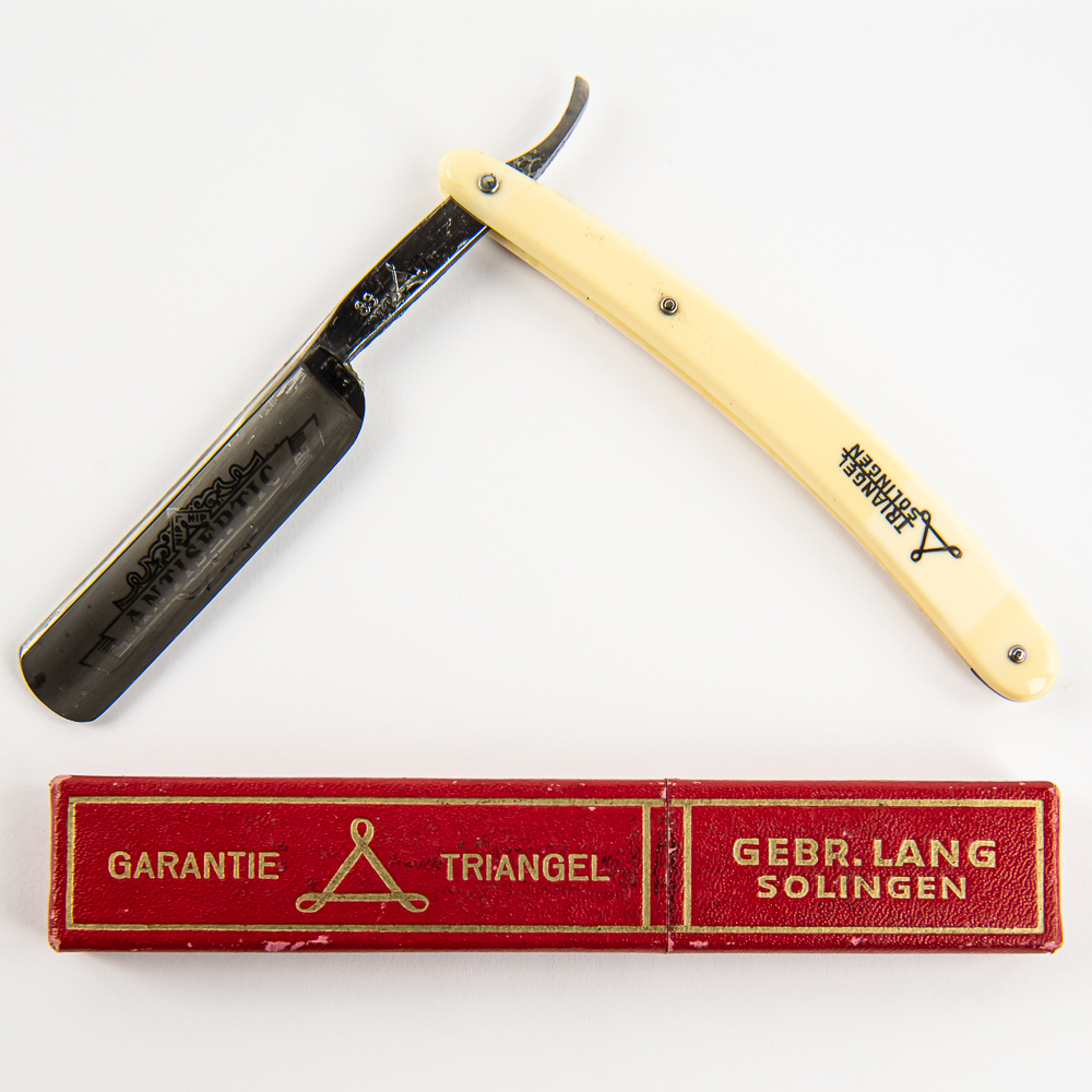Vintage Straight Razor “Antiseptic 33” by Triangel Soligen, with white/yellowed plastic scales with “Triangel Solingen” and logo pressed into side. The face reads “Antiseptic” , Tang reads “33” with logo, and reverse reads “Solingen Made in Germany”. Blade is in overall pristine condition, with beautiful luster, has cosmoline protectant applied. Triangel Garantie box IS included and is in great condition for its age, minor wear noted. See photos and bid accordingly.