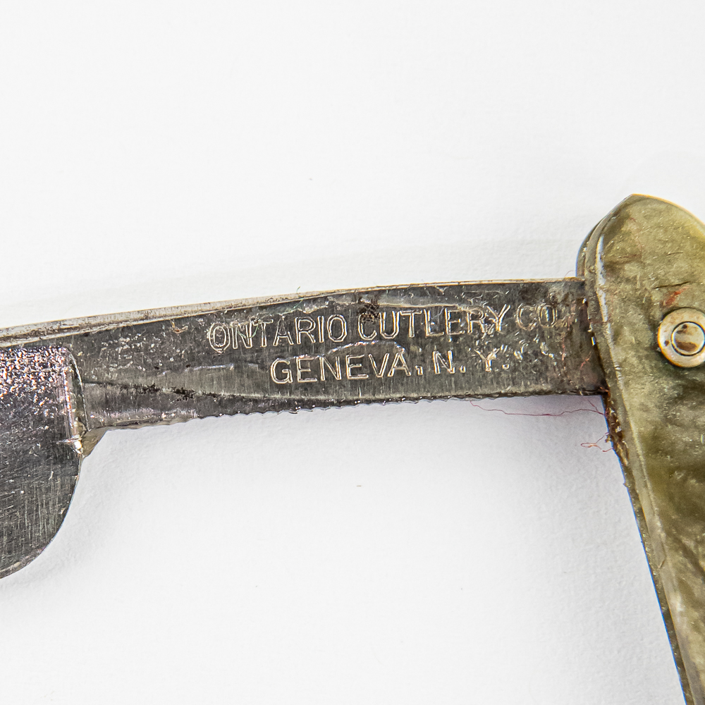 Vintage Straight Razor by Ontario Cutlery Co, with grey celluloid scales. The face is blank, Tang reads “Ontario Cutlery Co Geneva NY”, and reverse is blank. Blade is in overall great condition, with beautiful luster, has cosmoline protectant applied. Unoriginal box IS included and is in okay condition, top and bottom are taped. See photos and bid accordingly.