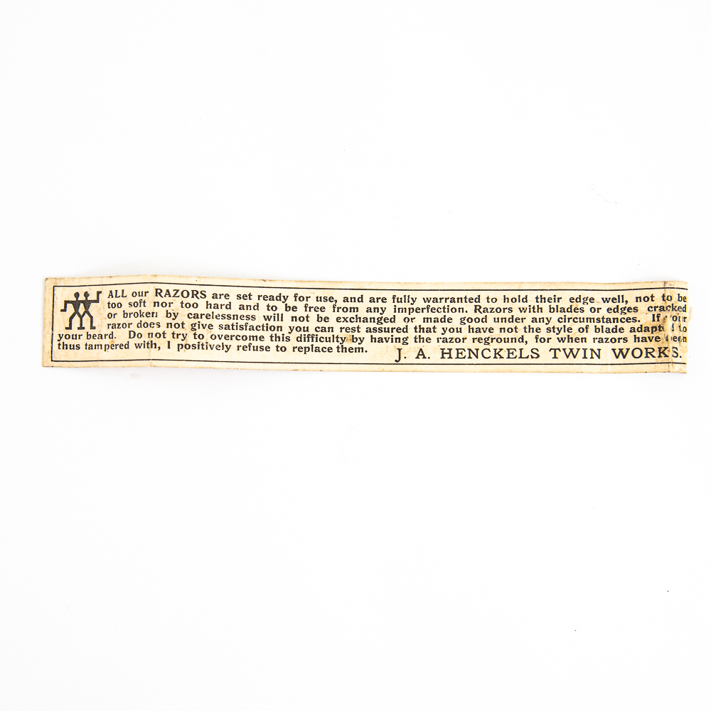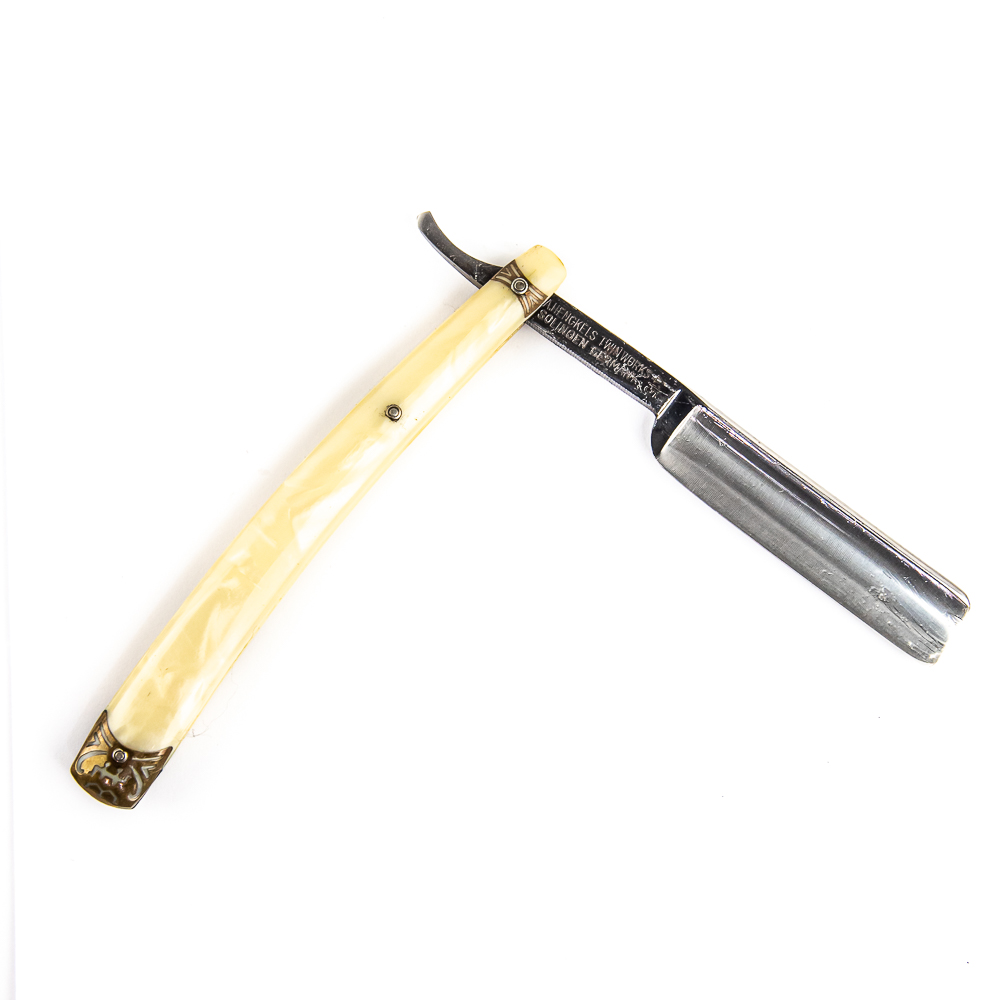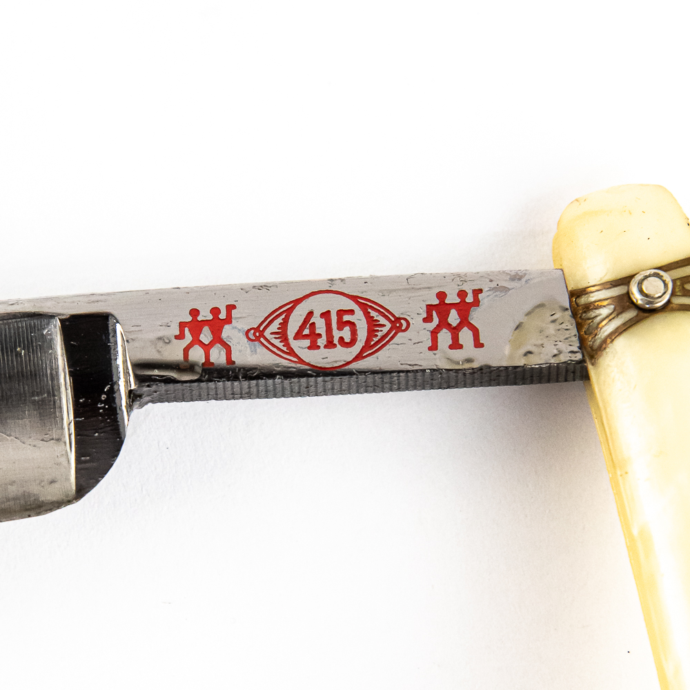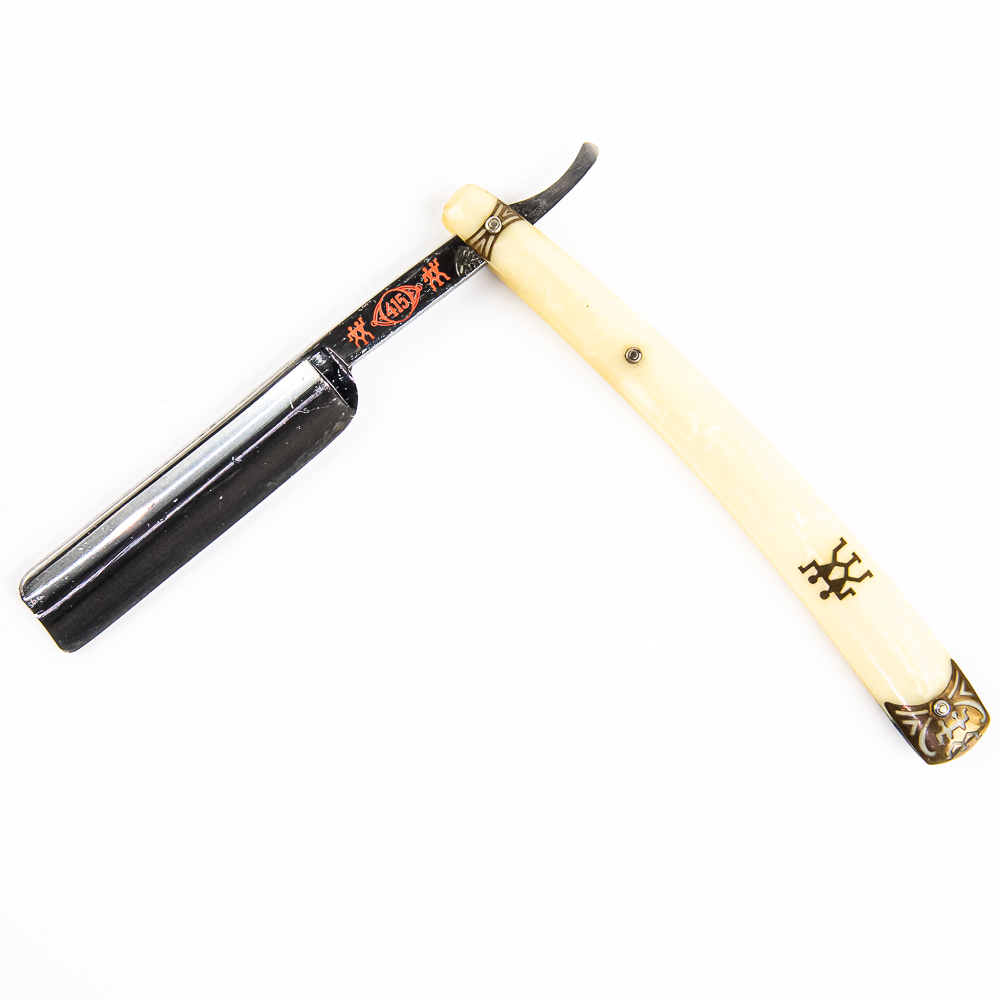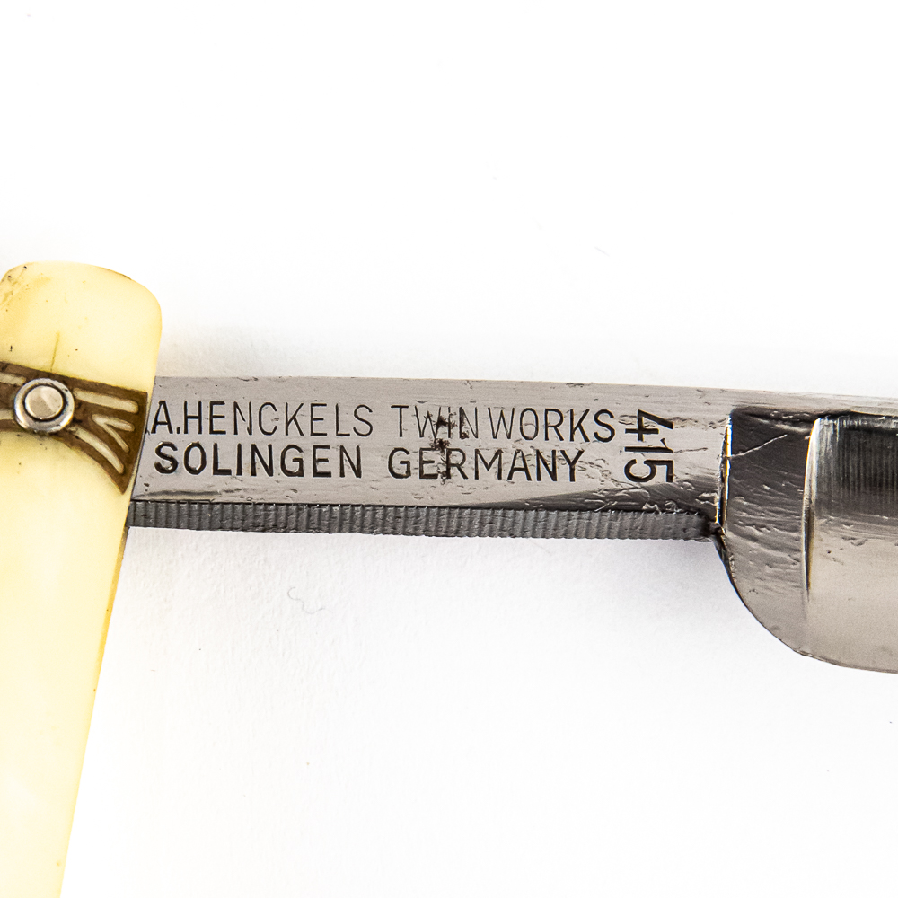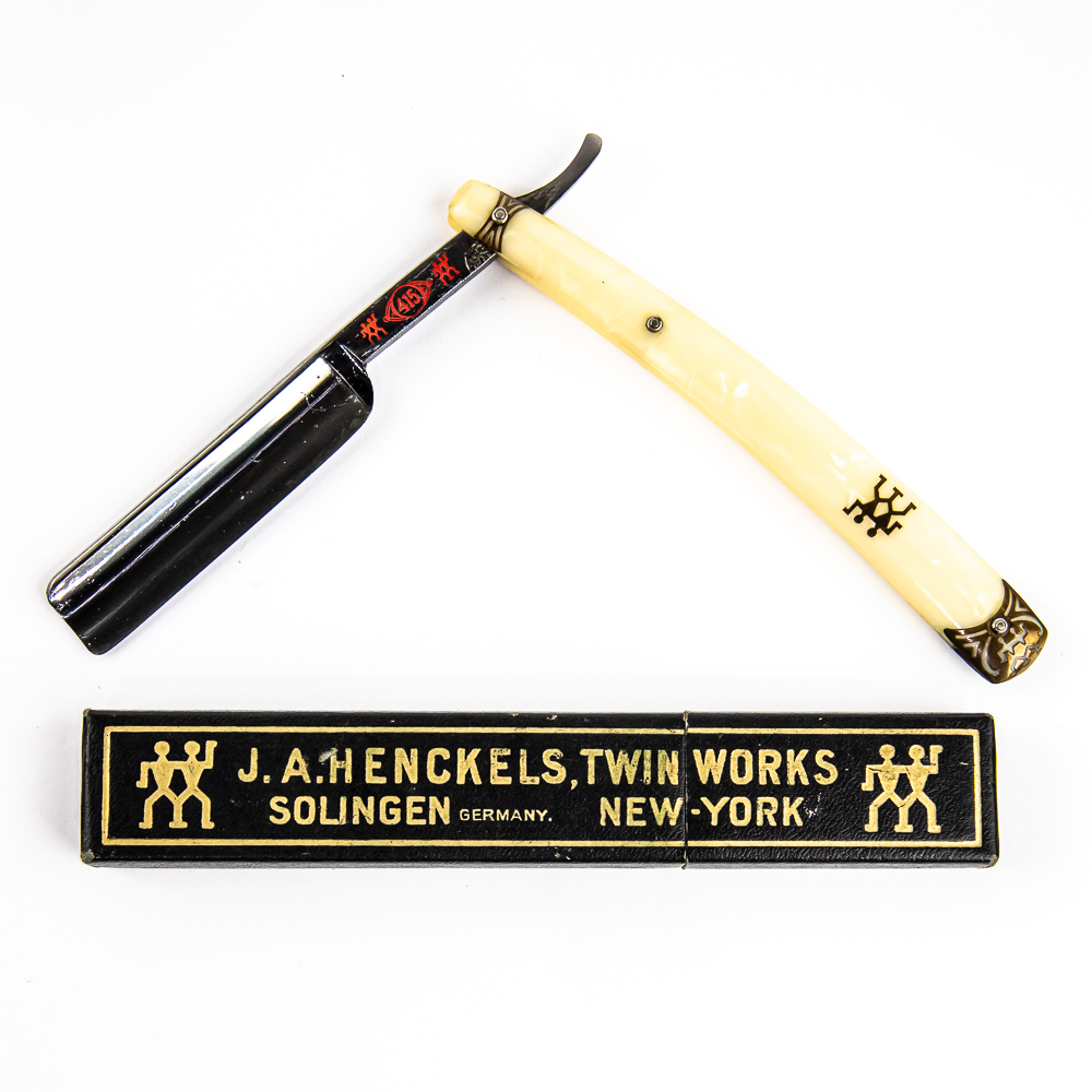 Vintage Straight Razor “415” by J.A. Henckels, Twin Works, with pearly celluloid scales, with logo and end caps, all brass colored, pressed into side. The face is blank, Tang reads “415” with logo all in red, and reverse reads J. A. Henckels Twin Works Solingen Germany” with “415” . Blade is in overall pristine condition, with beautiful luster, has cosmoline protectant applied. Original box IS included, and is in great condition. Included is small original instruction sheet. See photos and bid accordingly.