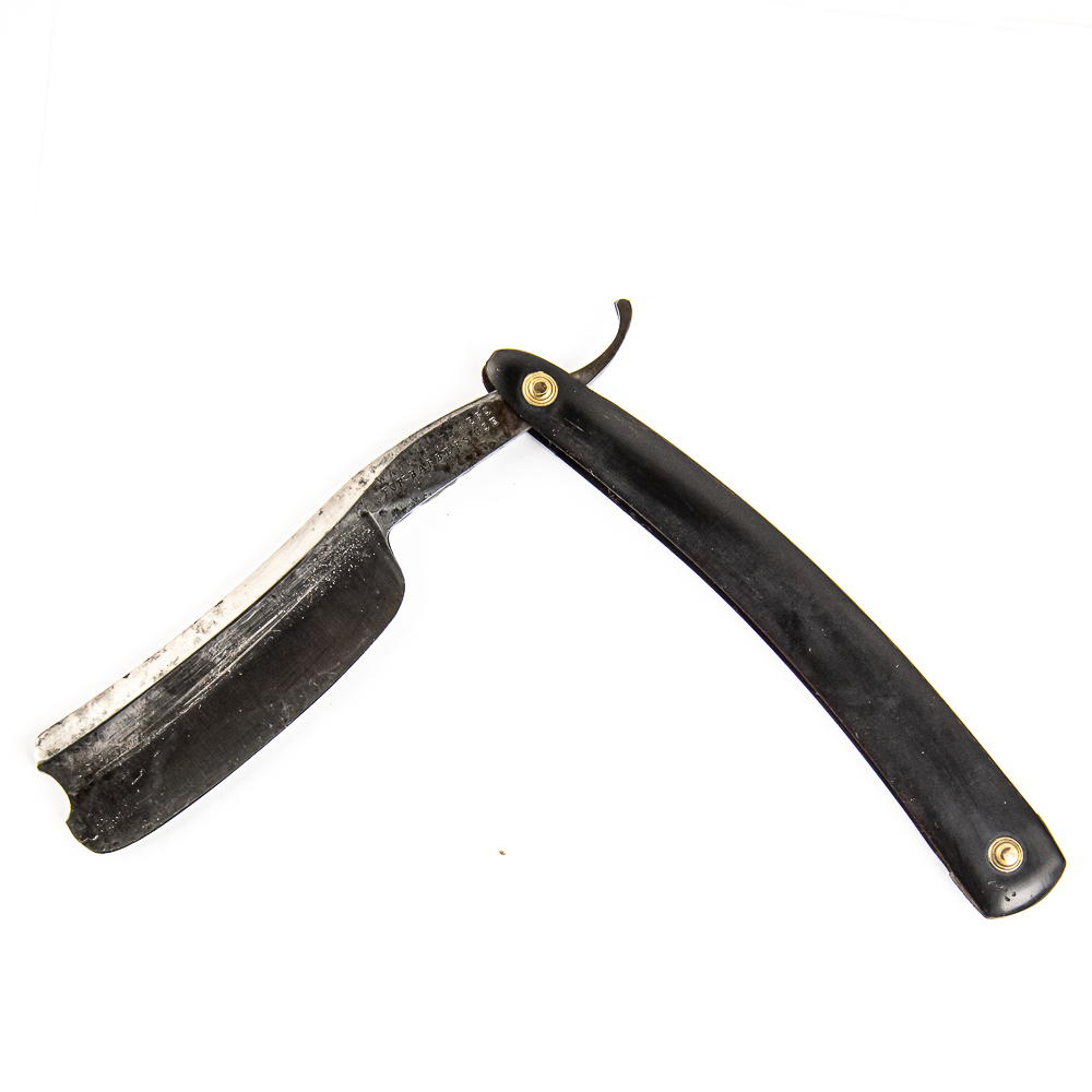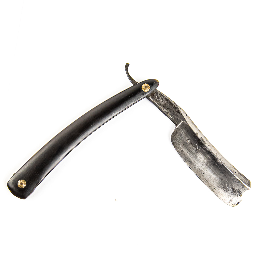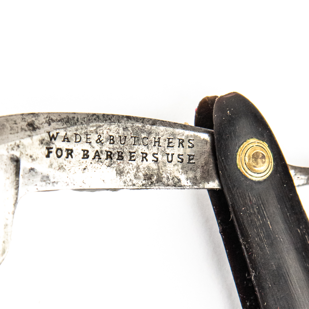 Large Barber’s Notch Blade! Vintage Straight Razor by Wade & Butcher, with black horn scales. The face is blank, Tang reads “Wade & Butcher for Barbers Use”, and reverse is blank. Large blade is in overall good condition, with nice luster, but a fair amount of tarnish throughout, has cosmoline protectant applied. Box is not included. See photos and bid accordingly.