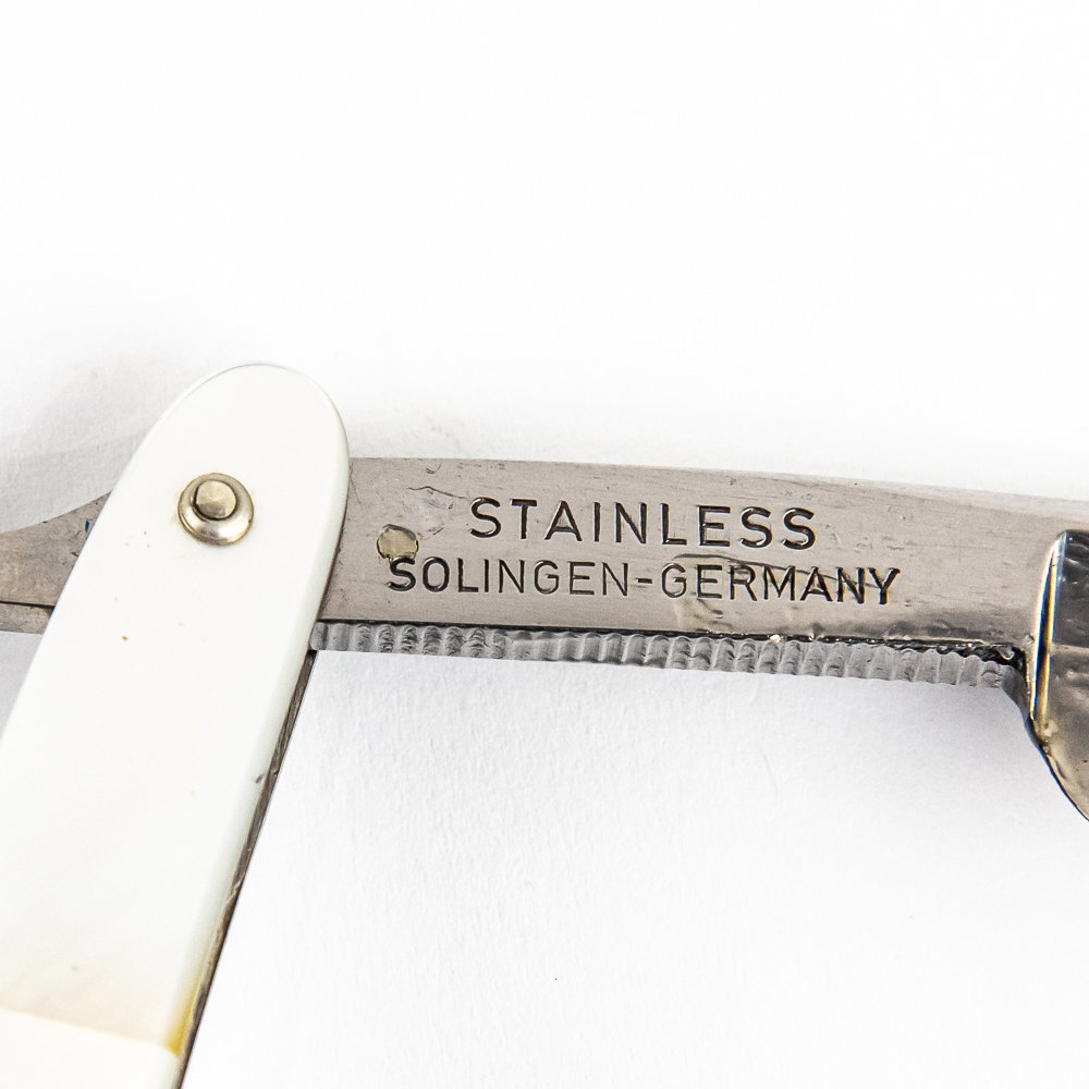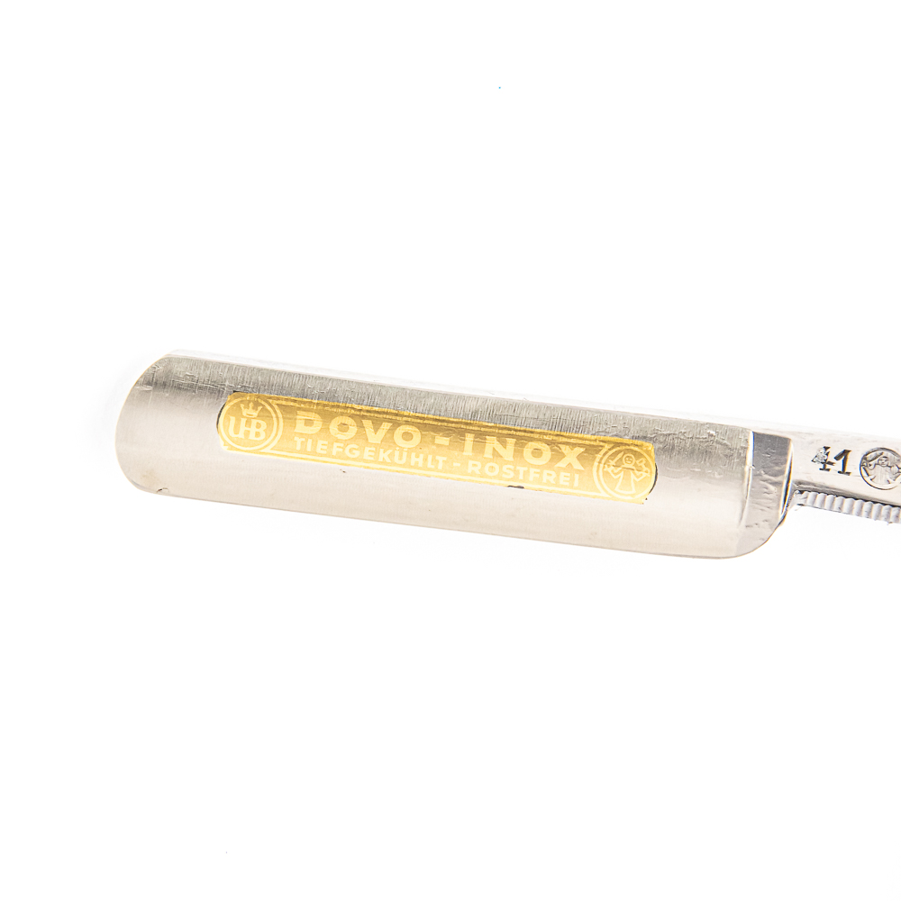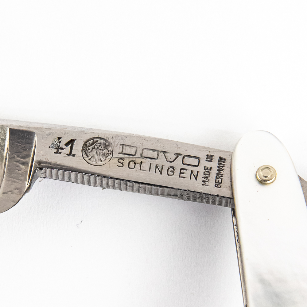 Beautiful Find! Vintage Straight Razor by Dovo Solingen, with pearly striped scales, that exhibit a heavier duty metal backing. The face has a golden finish that reads “Dovo-Inox Tiefgekuhlt Rostfrei”, Tang reads “41 Dovo Solingen Made in Germany” with logo, and reverse reads “Stainless Solingen-Germany”. Blade is in overall pristine condition, with beautiful luster, has cosmoline protectant applied. Original blue hard plastic case IS included and is in great condition. Razor still includes original Dovo Solingen wax paper wrapping. See photos and bid accordingly.
