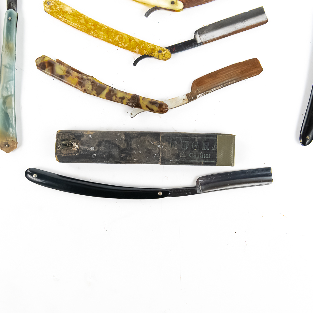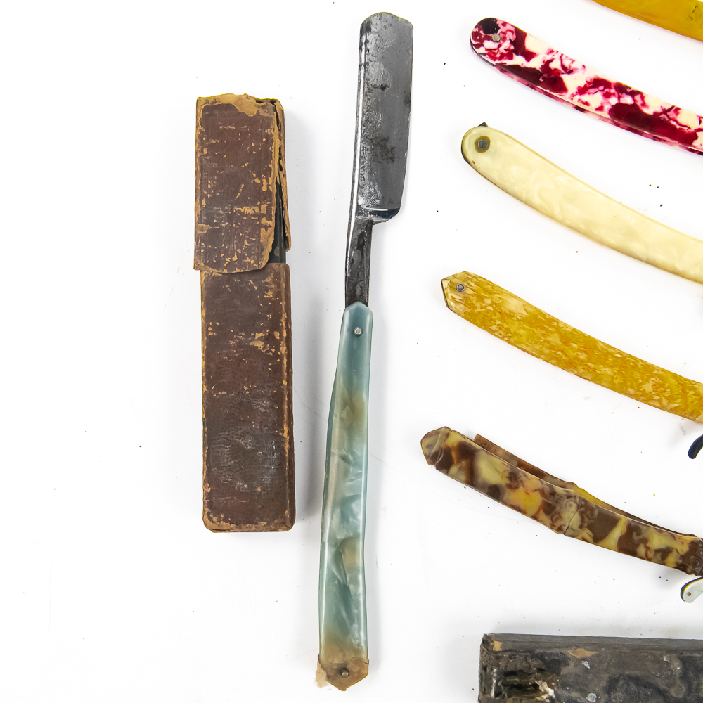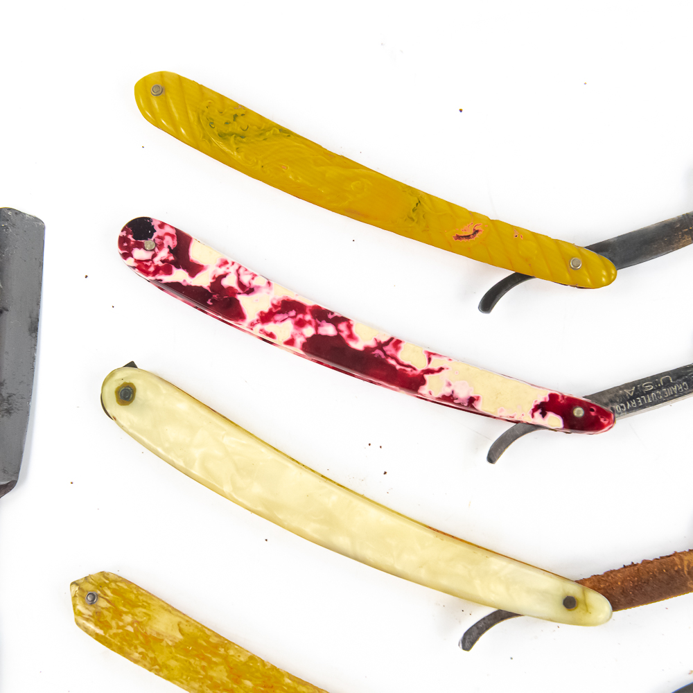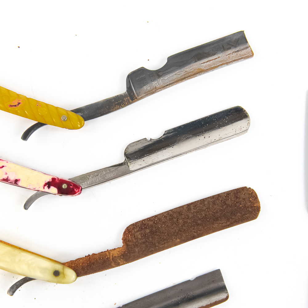 Lot of Straight Razor parts, includes 3 Razors w/ Box, 5 w/o box. All contents exhibit some form of damage, whether it be a chipped/rusted blade, broken scales, etc. Boxes may, or may not match. Conditions vary. See photos and bid accordingly.