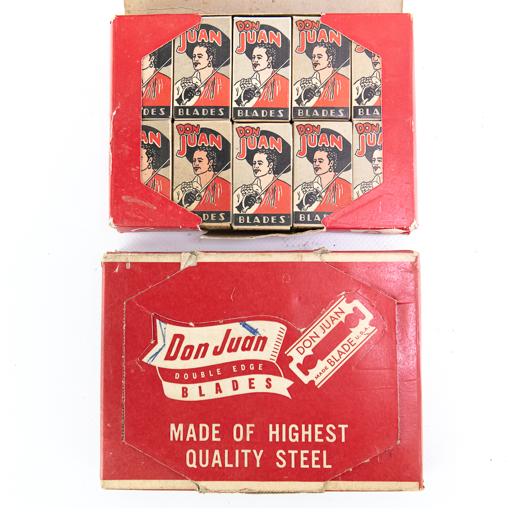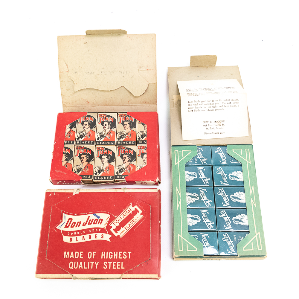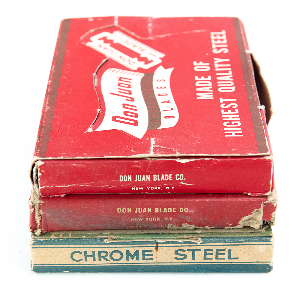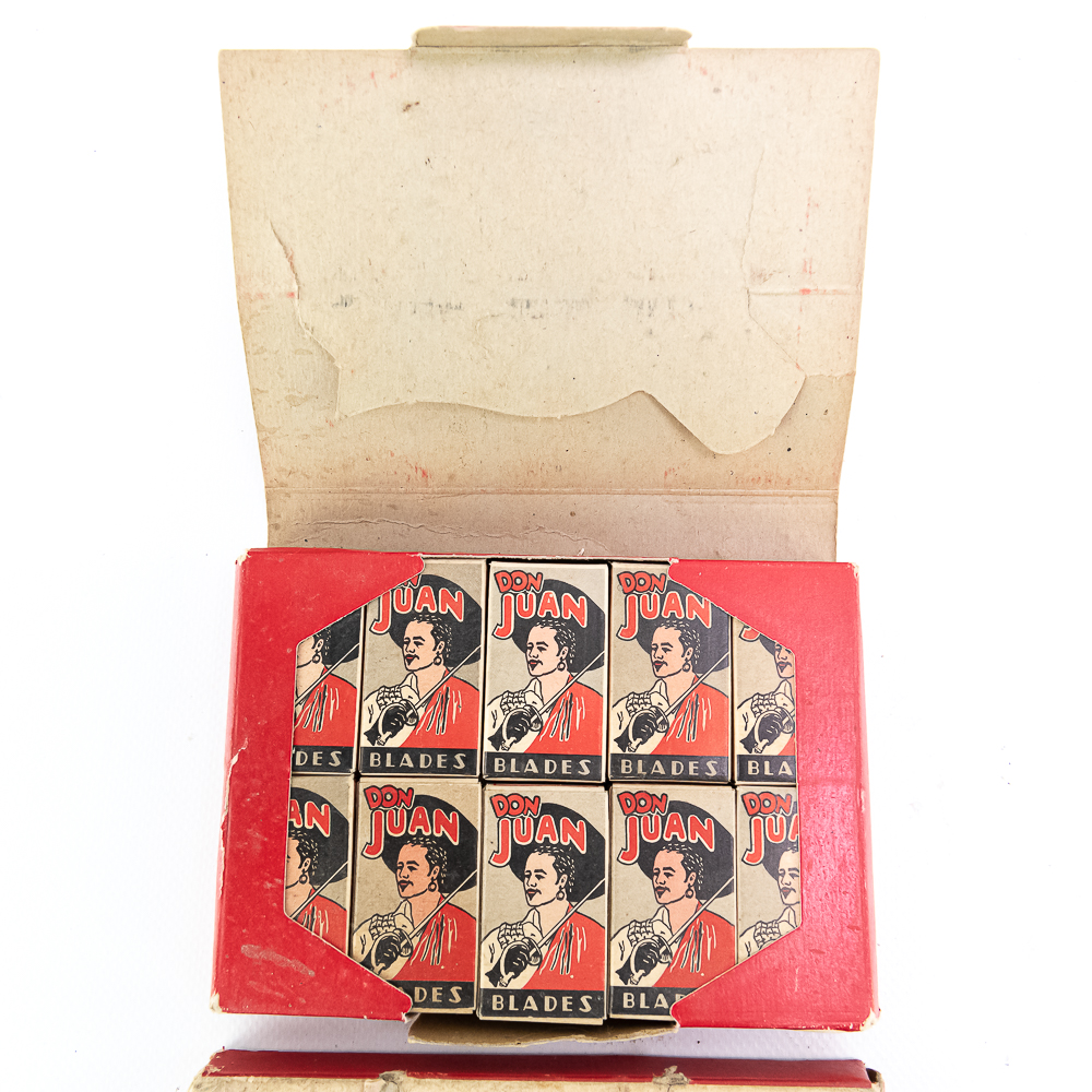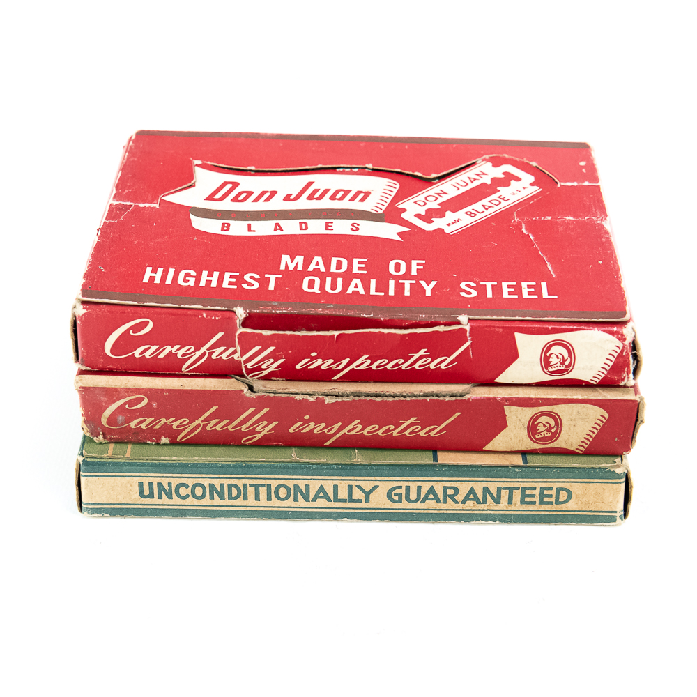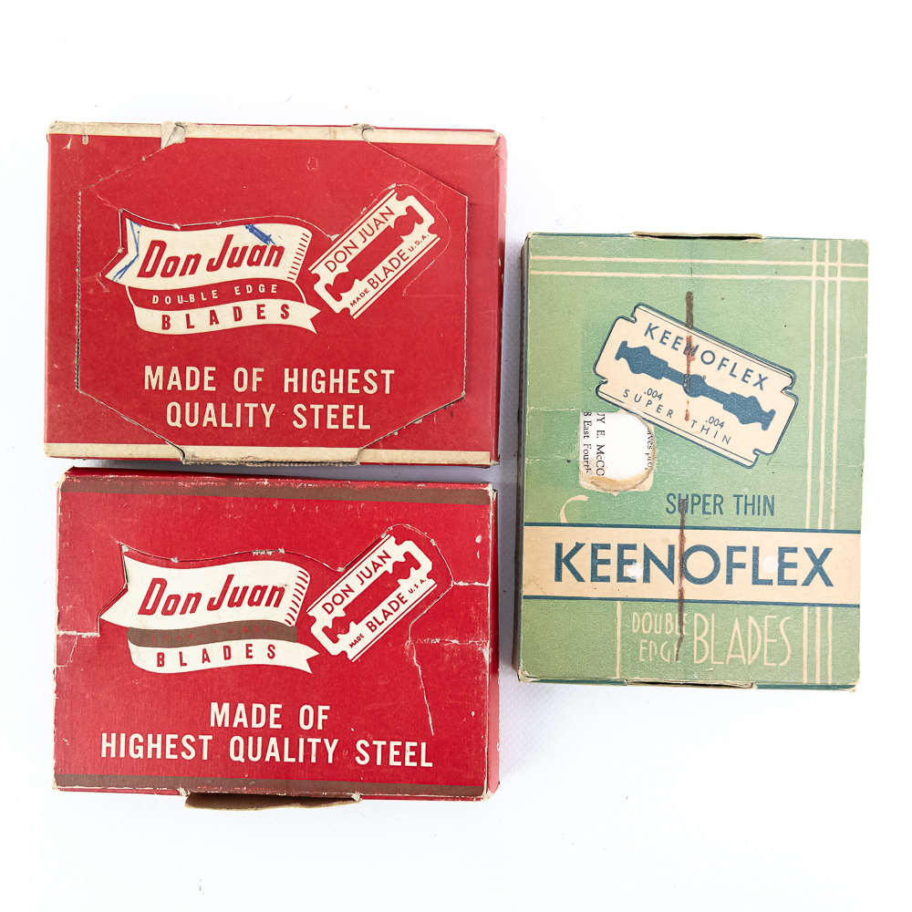 Included is (2) Don Juan Double Edge Blade displays, in fair condition with obvious signs of wear indicative of age and storage. Both appear to be complete. Also Included is (1) Keenoflex Super Thin Double Edge blade display in fair condition with stains and obvious signs of wear present, and appears to be complete. See photos and bid accordingly.