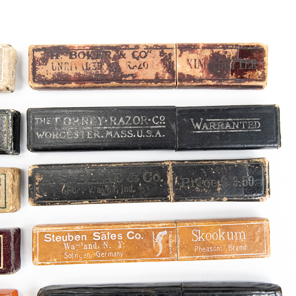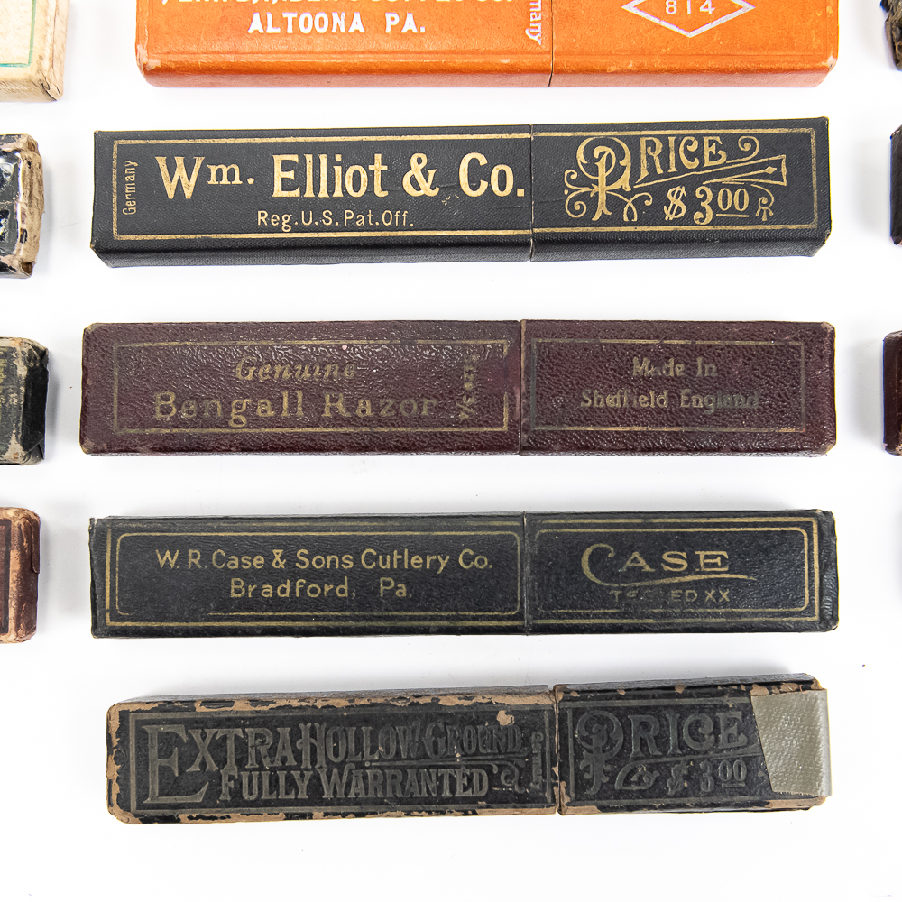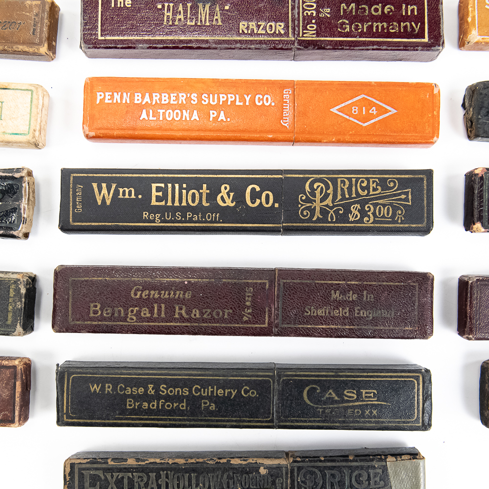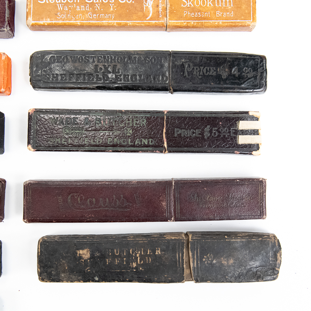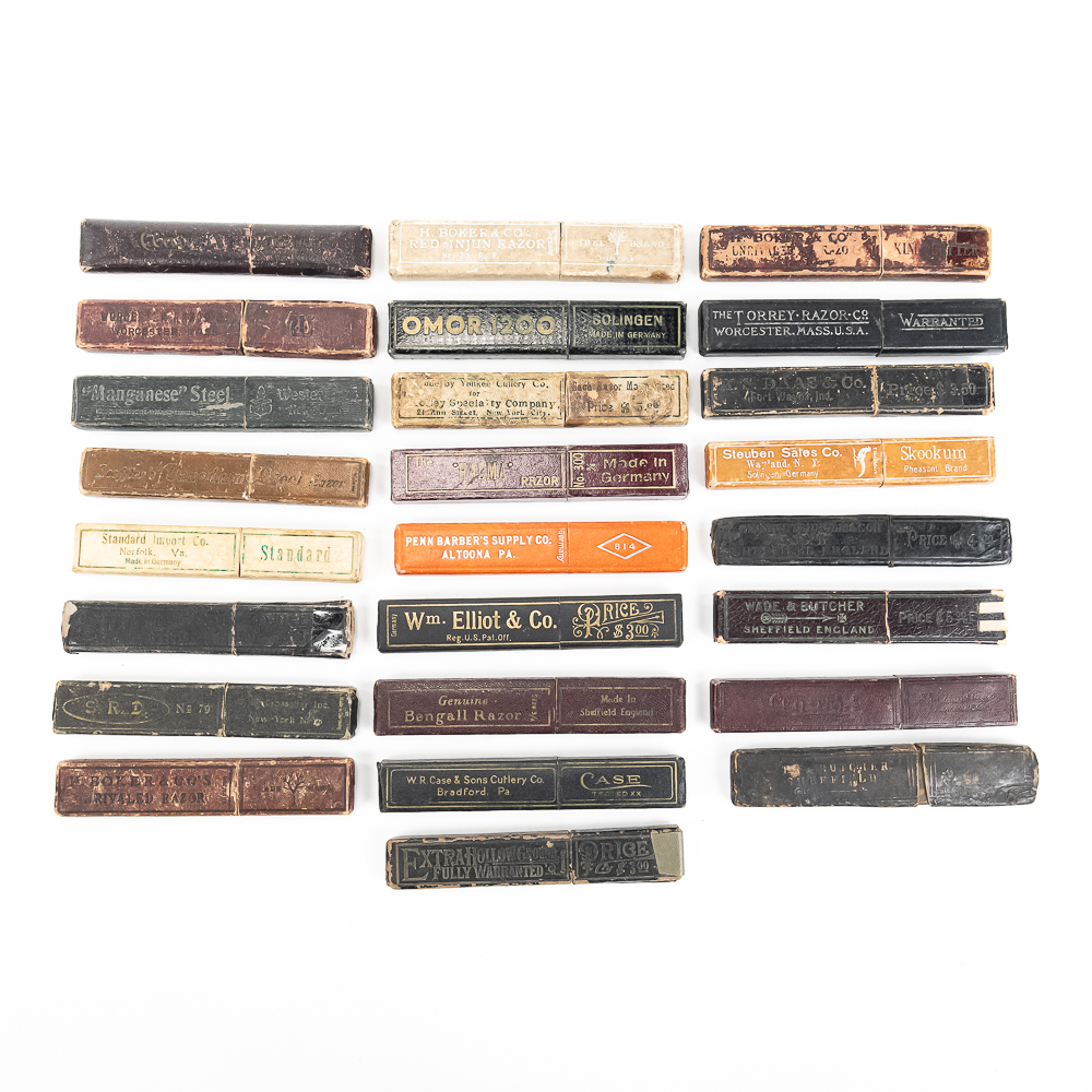 Large lot of miscellaneous Straight Razor boxes, with notable names such as H. Boker & Co, Wade & Butcher, Clauss, Genco, and Case. Conditions Vary, see photos and bid accordingly.