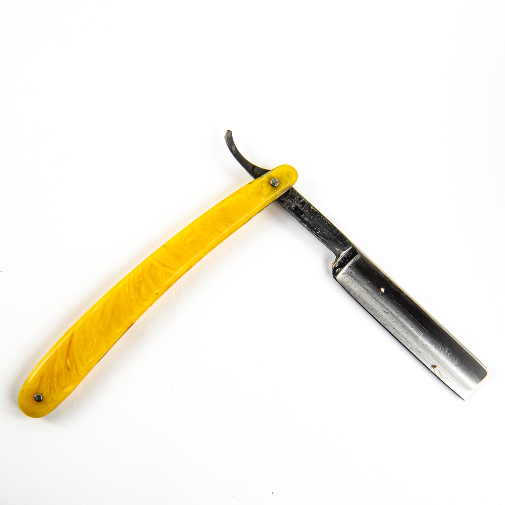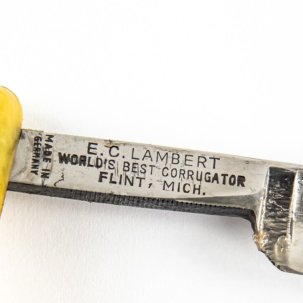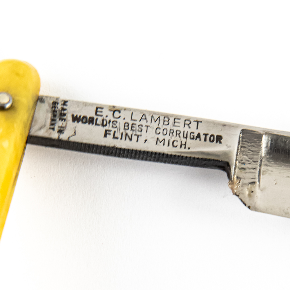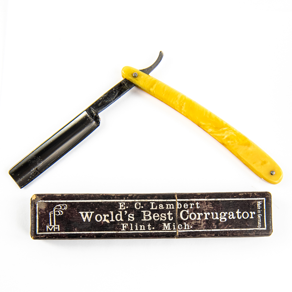 Vintage Straight Razor “World’s Best Corrugator” by E.C. Lambert, with yellow celluloid scales. The face is blank with a light rust/tarnish mark, Tang reads “Merheiso”, and reverse reads “E.C. Lambert World’s Best Corrugator Flint, Mich”. Blade is in overall great condition, with nice luster, but minor tarnish markings and swirls noted, has cosmoline protectant applied. Original box IS included and is in good condition. See photos and bid accordingly.