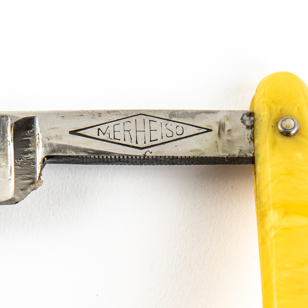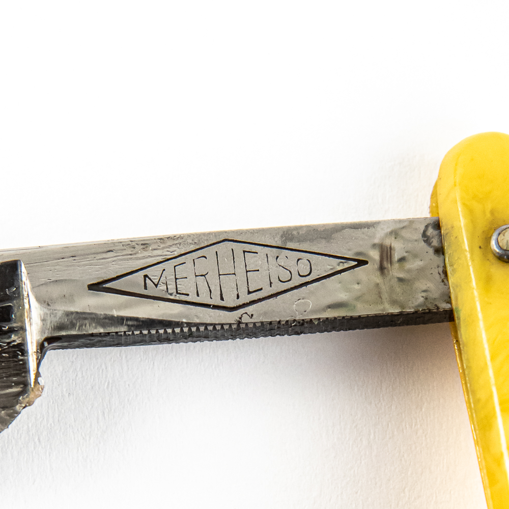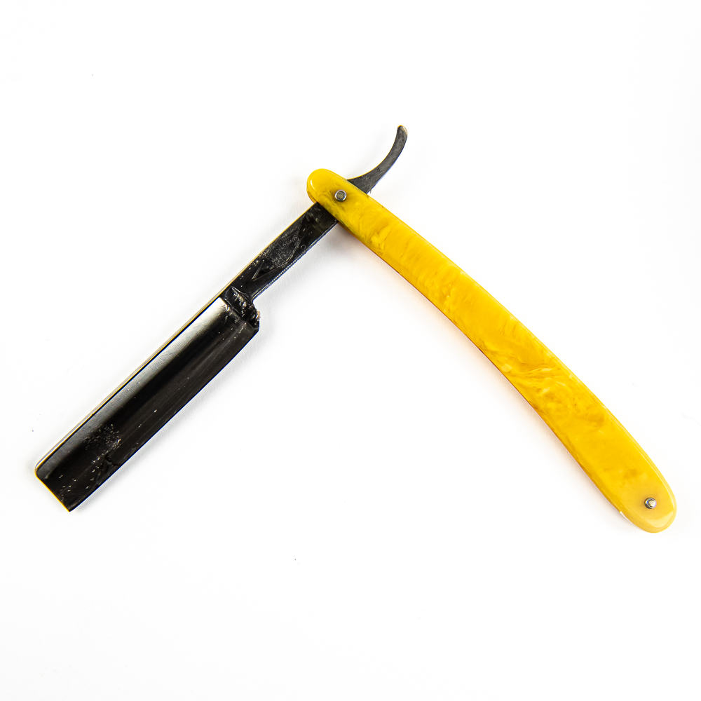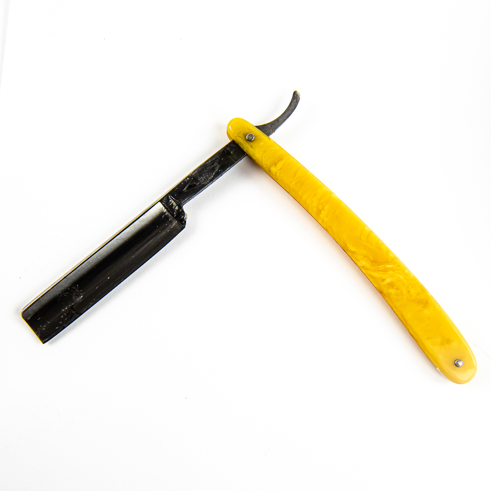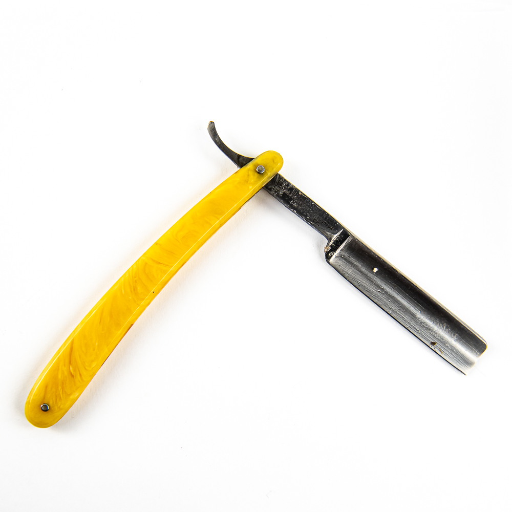 Vintage Straight Razor “World’s Best Corrugator” by E.C. Lambert, with yellow celluloid scales. The face is blank with a light rust/tarnish mark, Tang reads “Merheiso”, and reverse reads “E.C. Lambert World’s Best Corrugator Flint, Mich”. Blade is in overall great condition, with nice luster, but minor tarnish markings and swirls noted, has cosmoline protectant applied. Original box IS included and is in good condition. See photos and bid accordingly.