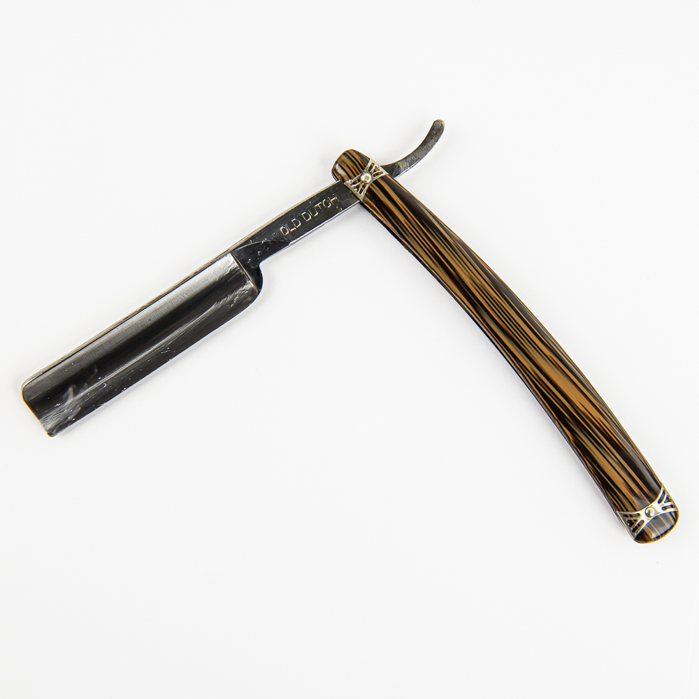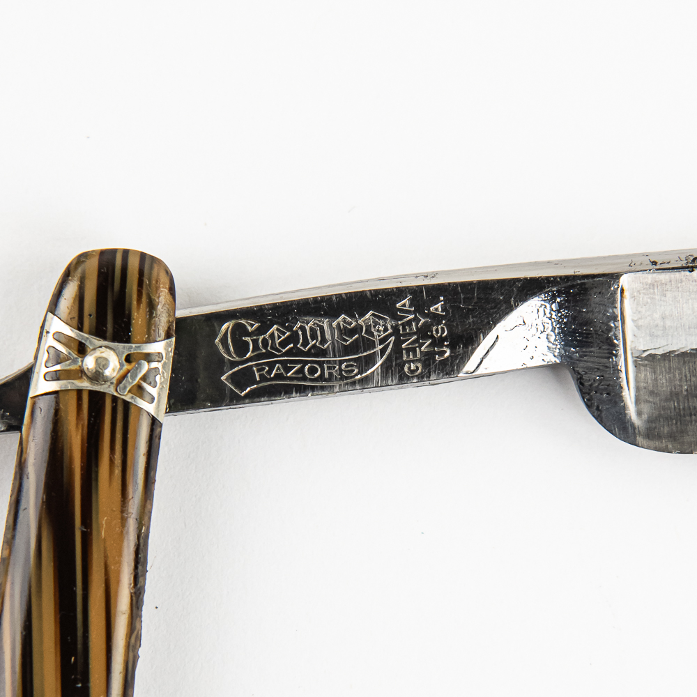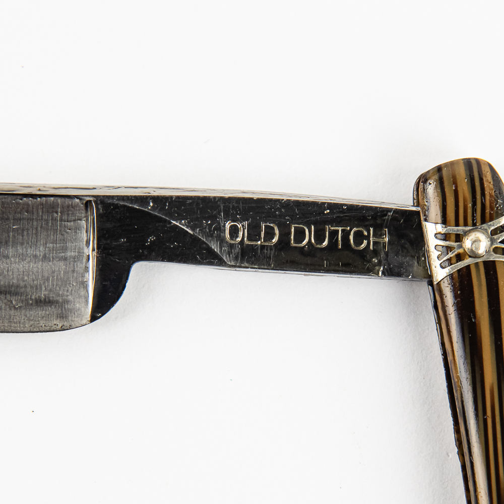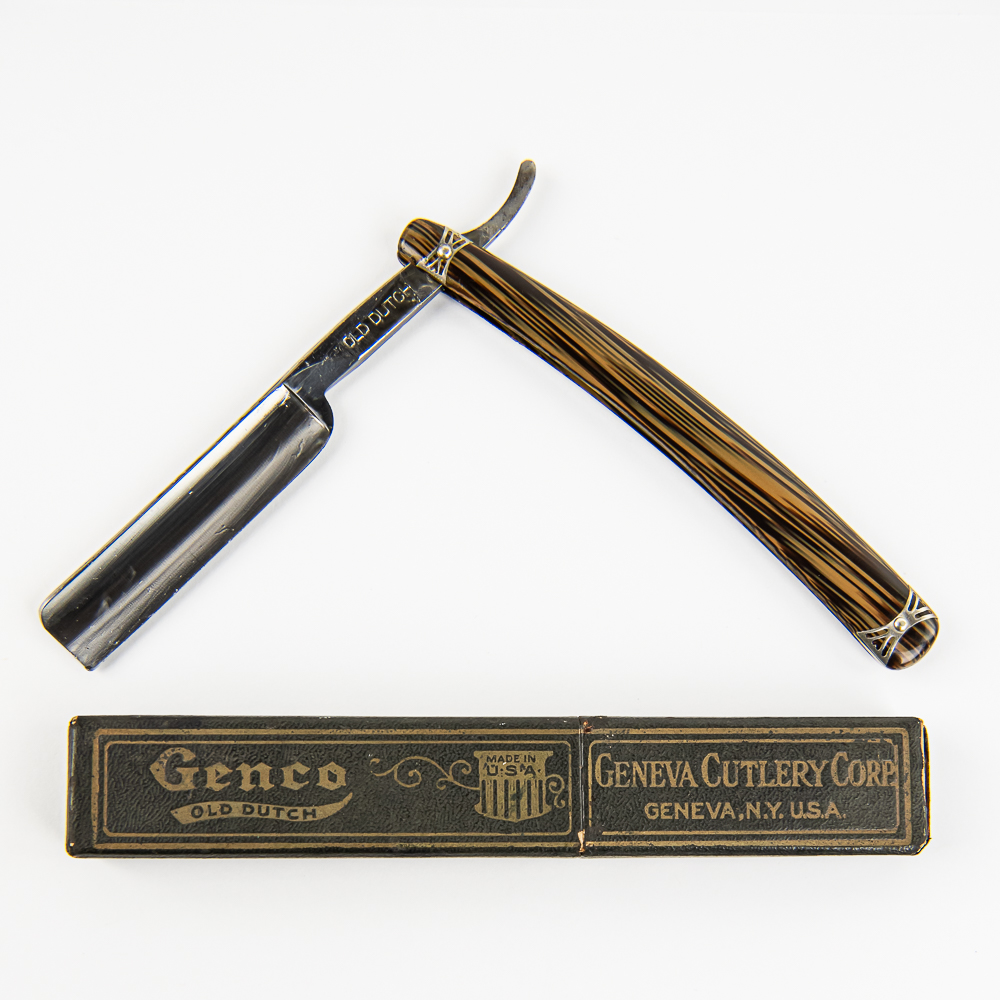 Vintage Straight Razor “Old Dutch” by Genco, with faux-wood style scales with pressed metal design near both pins. The face is blank, Tang reads “Old Dutch”, and reverse reads “Genco Razors Geneva N.Y U.S.A.” Blade is in overall pristine condition, with beautiful luster, has cosmoline protectant applied. Original Box IS included and is in great condition. See photos and bid accordingly.
