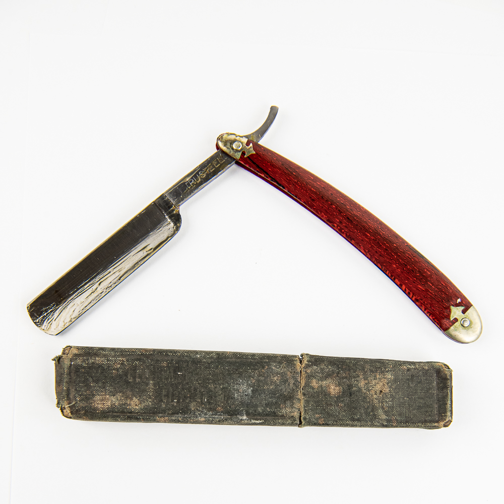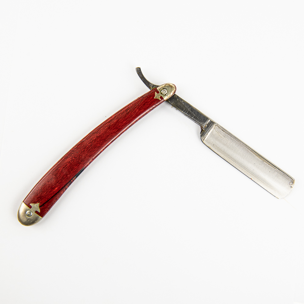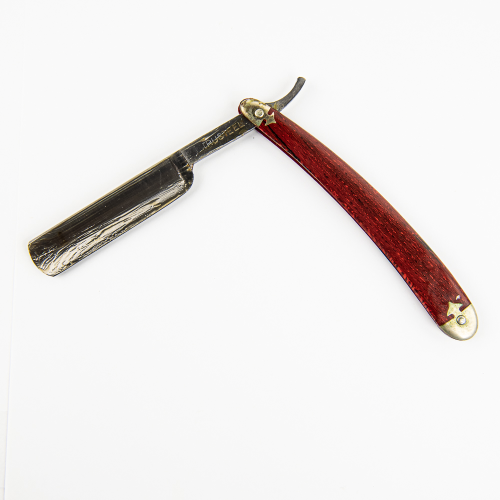 Vintage Straight Razor “Trusteel”, with faux-redwood scales, with metal caps at both ends that both have some tarnish. The face is blank, Tang reads “TRUSTEEL”, and reverse is blank. Blade is in overall pristine condition, with beautiful luster, has cosmoline protectant applied. Unoriginal box IS included and is in poor condition. See photos and bid accordingly.