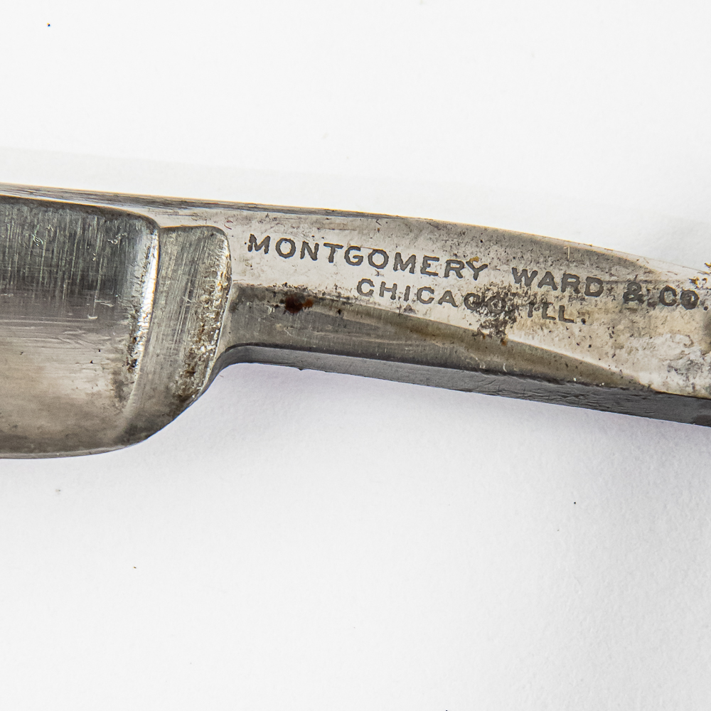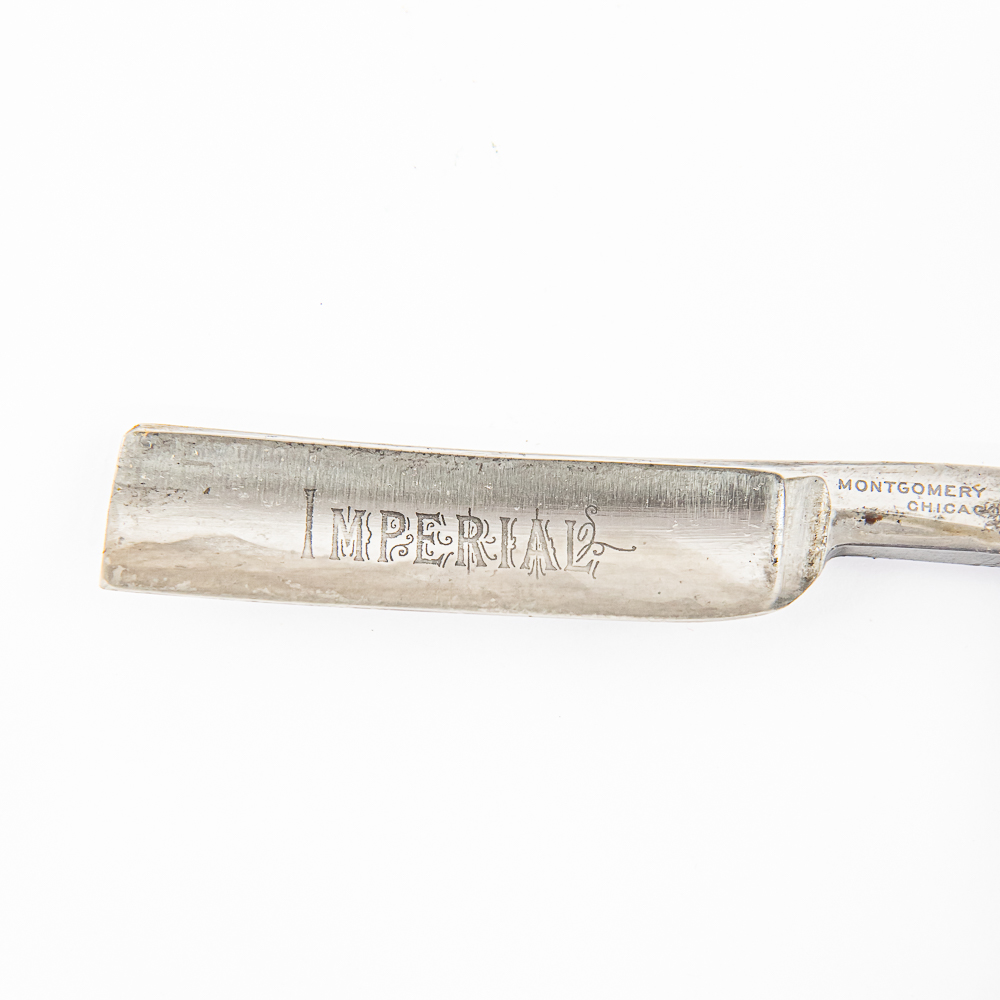 Vintage Straight Razor “Imperial” by Montgomery Ward & Co, with black bakelite scales that have missing chipped piece near pivot pin. The face reads “Imperial” , Tang reads “Montgomery Ward & Co Chicago, Ill.”, and reverse is blank. Blade is in overall great condition, with nice luster and minimal tarnish, mainly near pivot pin, has cosmoline protectant applied. Unoriginal box IS included, is black with no markings and is in fair condition. See photos and bid accordingly.
