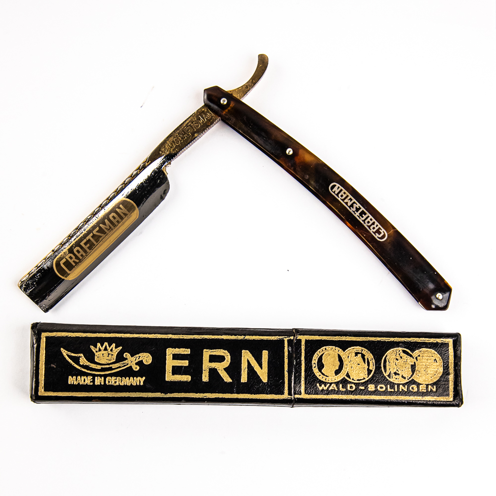 Vintage Straight Razor “9210” by Craftsman, with a darker faux-tortoiseshell scales with “Craftsman” on side. The face reads “Craftsman”, Tang reads “9210 Craftsman”, and reverse reads “ERN Wald-Solingen Made in Germany”. Blade is in overall great condition, with beautiful luster, has cosmoline protectant applied. Original box IS included and is in great condition. See photos and bid accordingly.