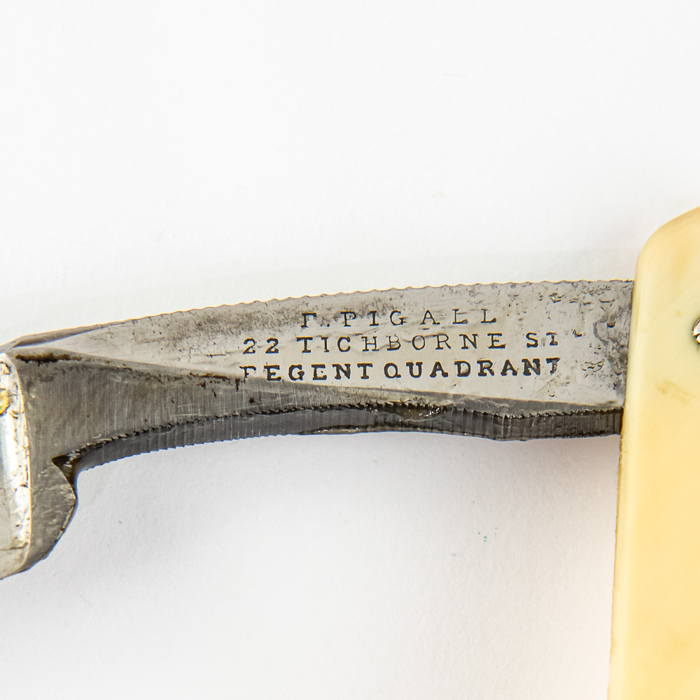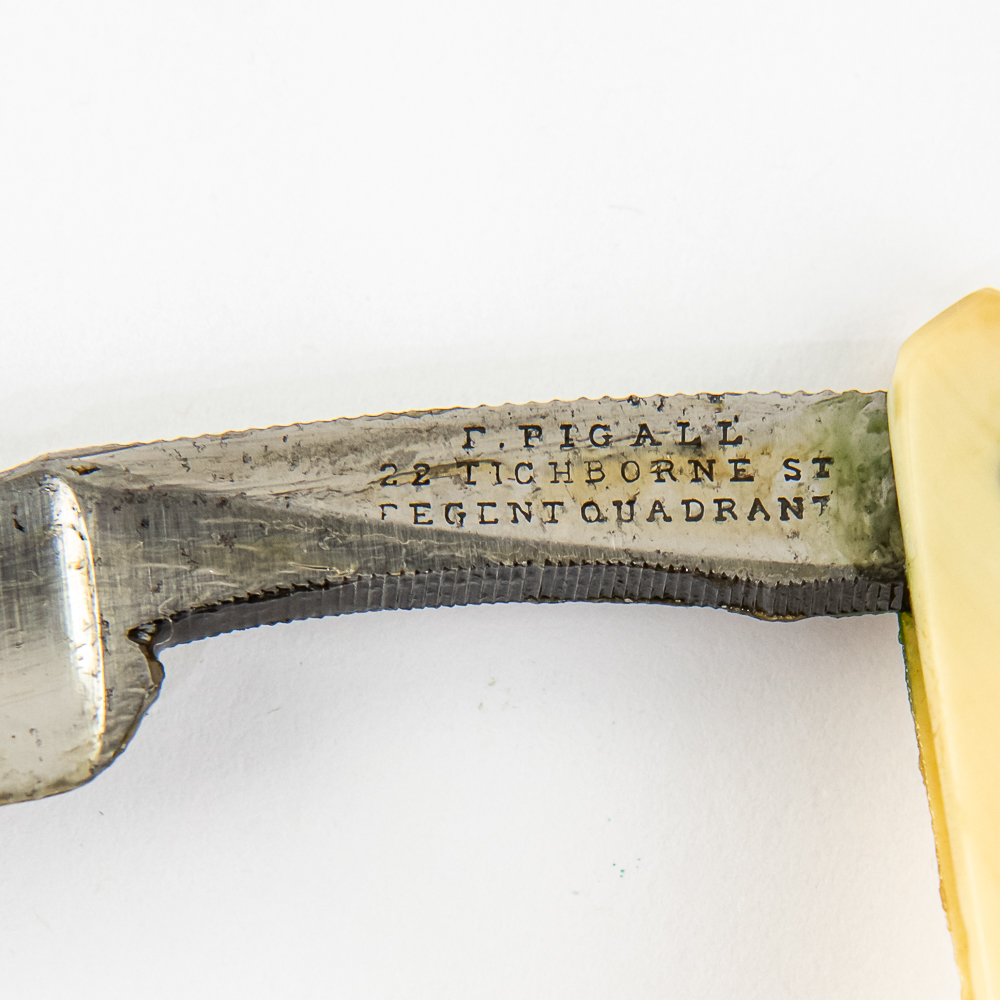 Vintage Straight Razor set by F. Pigall, both razors are near-identical with off-white celluloid scales. The face is blank, Tang reads “F. Pigall 28 Tichborne St Tegent Quadrant” , and reverse is blank. Blade is in overall near-pristine condition, with beautiful luster, has cosmoline protectant applied. Wooden Hard box IS included, lined with purple velvet material and is in great condition all-around with some signs of age and storage present. See photos and bid accordingly.