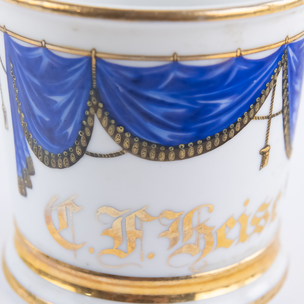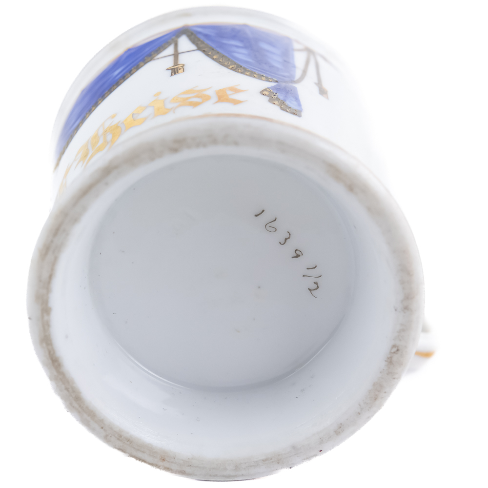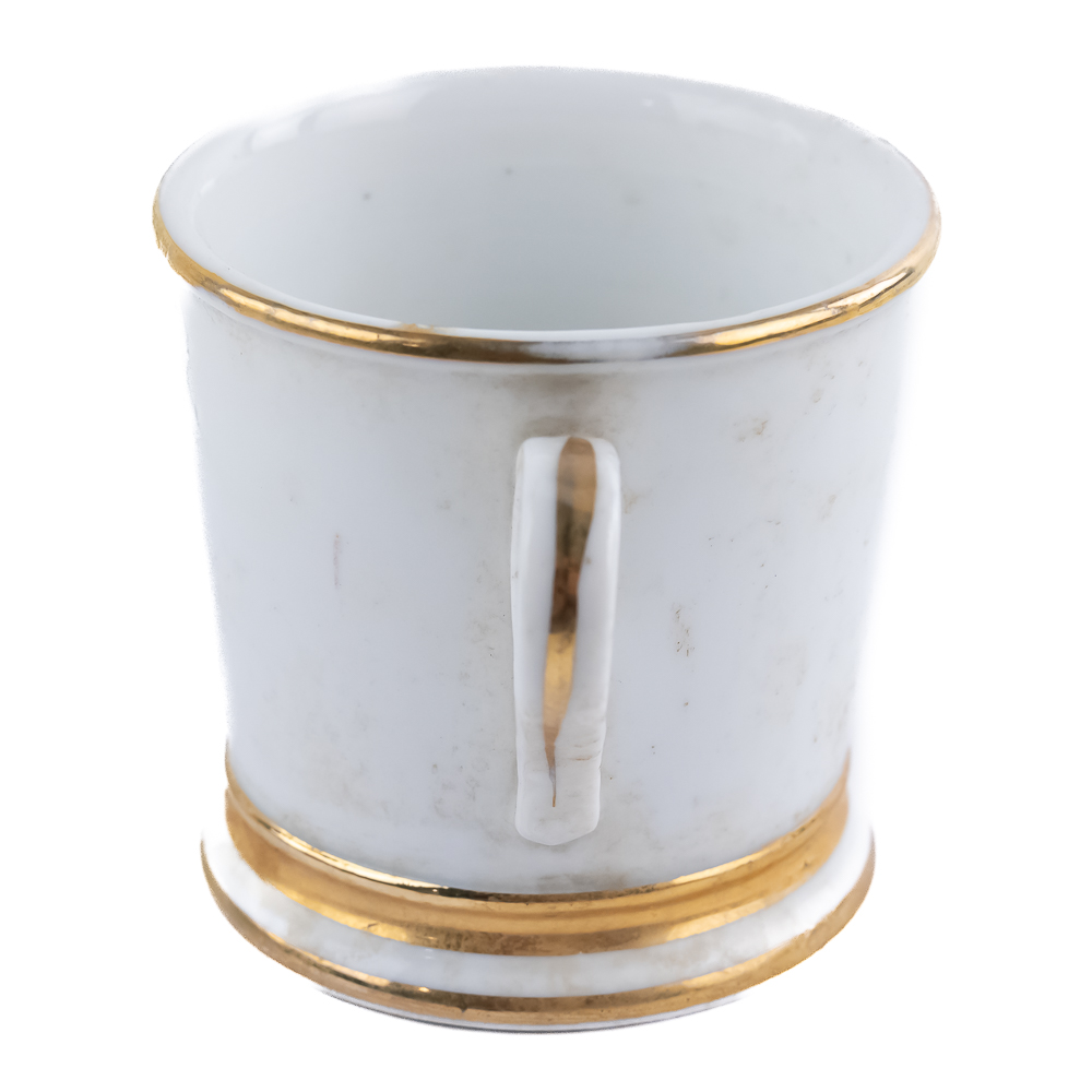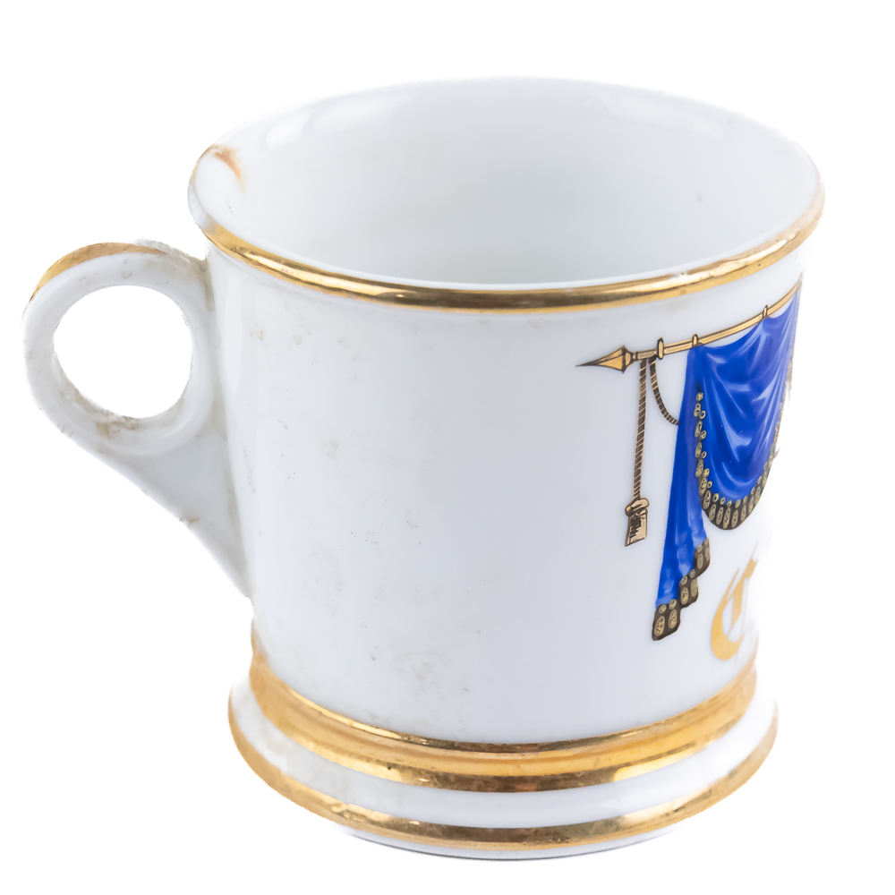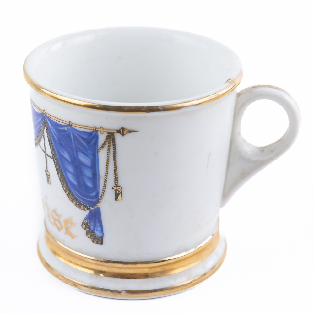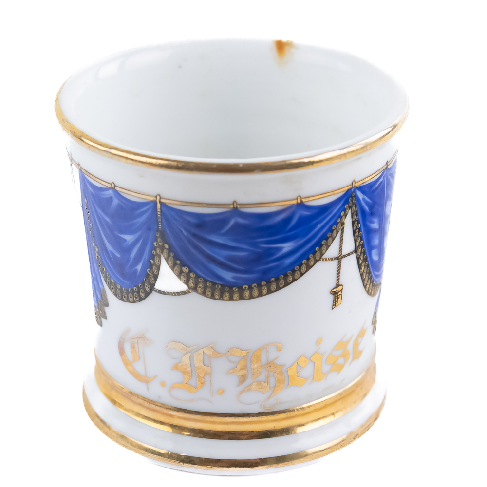 Vintage personalized shaving mug that exhibits a blue drapery scene with the name “J. F. Beise”. On bottom of mug, it reads “1639 1/2″. No other markings or Identification present. Measures approximately 4.5″ L x ” W x 3.5″ H. See photos and bid accordingly.