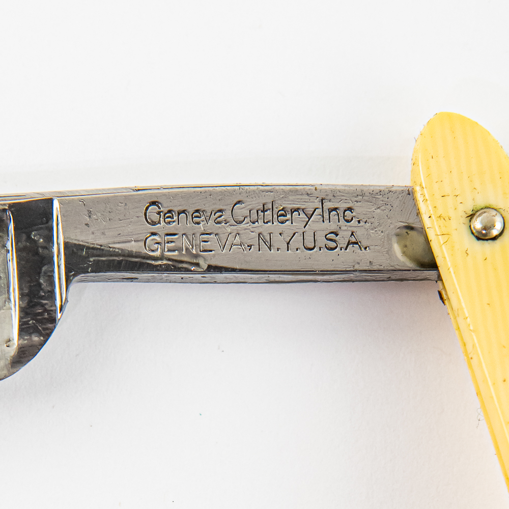 Vintage Straight Razor by Geneva Cutlery Inc, with off-white/yellowed celluloid scales. The face is blank, Tang reads “Geneva Cutlery Inc Geneva N.Y. U.S.A.”, and reverse is blank. Blade is in overall pristine condition, with beautiful luster, has cosmoline protectant applied. Original Box IS included and is in poor condition, reads “Pyramid Brand” and cap is taped together. See photos and bid accordingly.