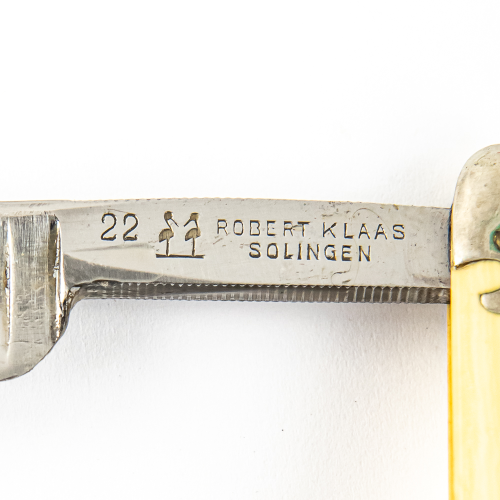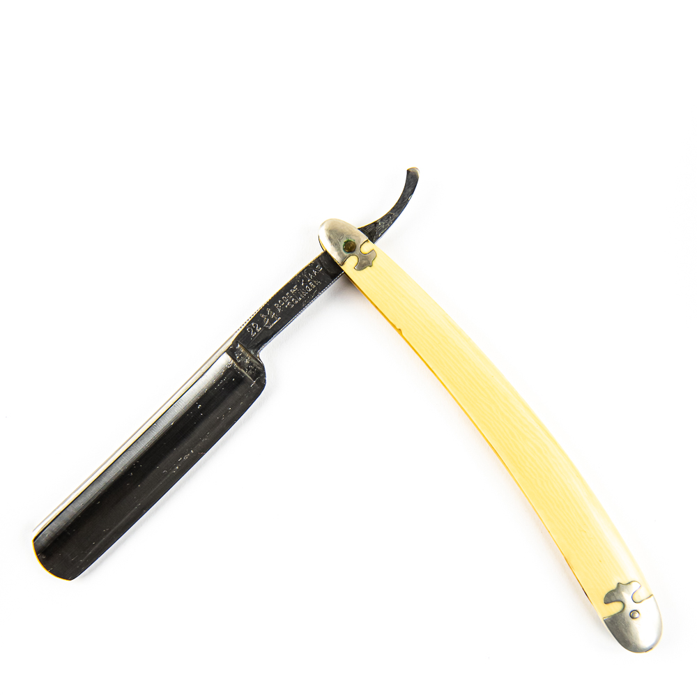 Vintage Straight Razor “22”, with yellowed celluloid scales and metal caps on ends. The face is blank, Tang reads “22 Robert Klass Solingen” w/ logo, and reverse is blank. Blade is in overall great condition, with shiny luster, has cosmoline protectant applied. Unoriginal box IS included and is in rough condition. See photos and bid accordingly.