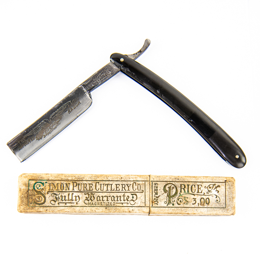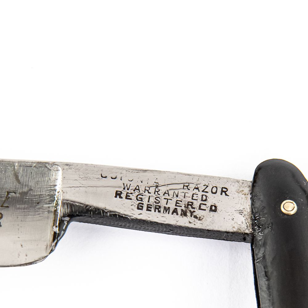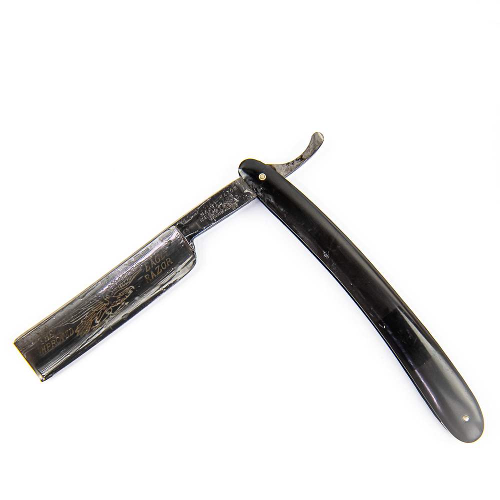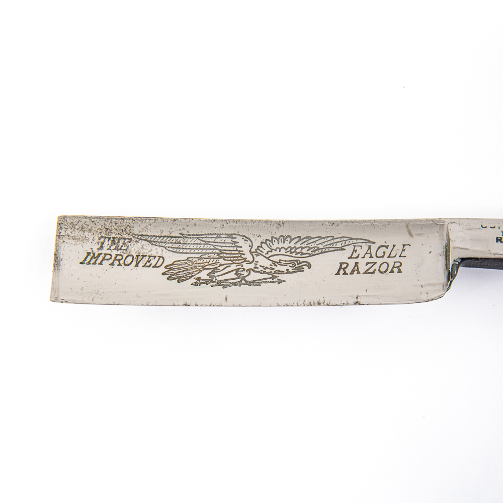 Vintage Straight Razor “The Improved Eagle Razor”, with black plastic scales, which on front has darker square off-centered. The face reads “The Improved Eagle Razor” with eagle, Tang reads “Razor Warranted Registered Germany” with first word not visible, and reverse is blank. Blade is in overall great condition, with shiny luster, has cosmoline protectant applied. Unoriginal box IS included and is in rough condition. See photos and bid accordingly.