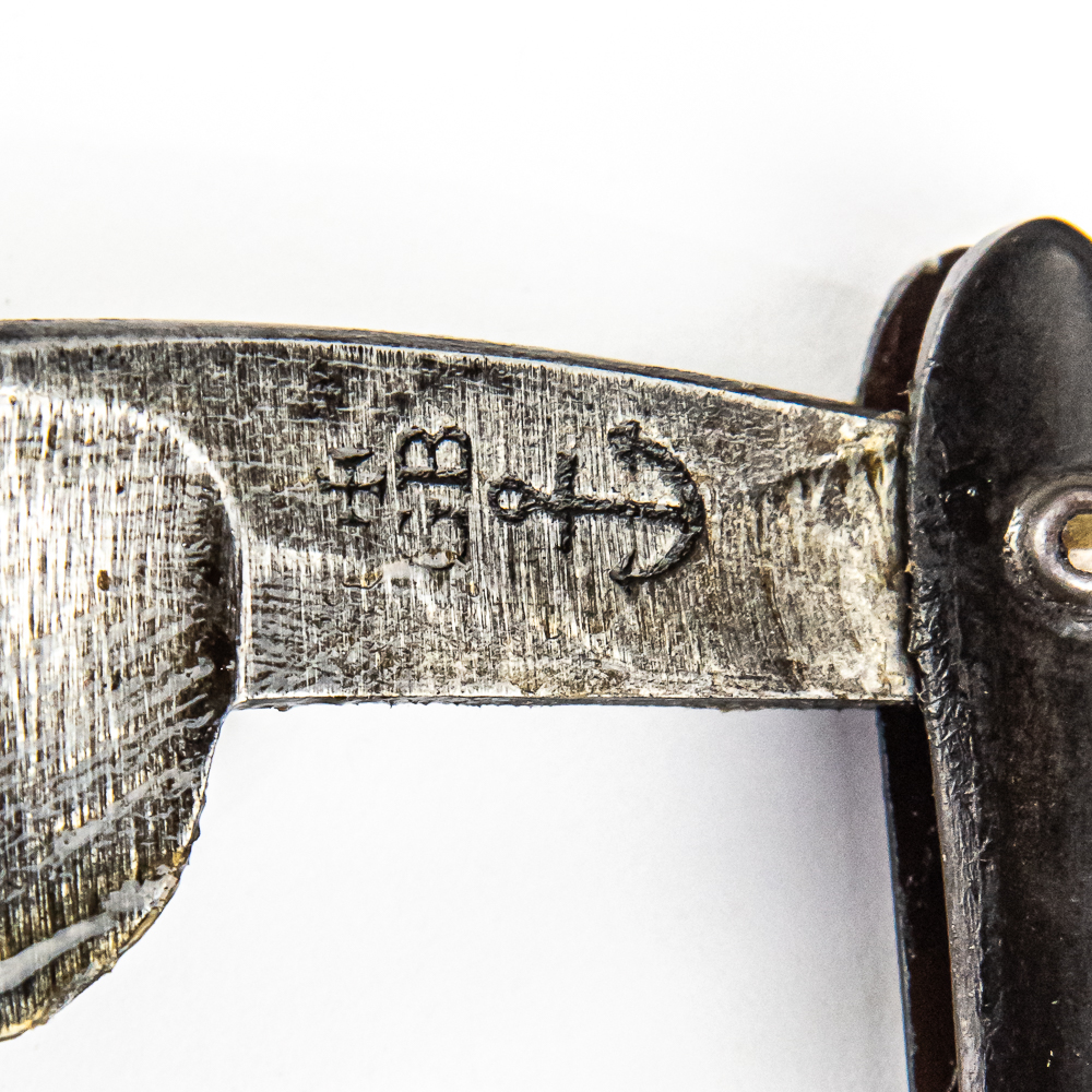 LARGE BLADE! Vintage Straight Razor, with black horn-like scales, with crack near wedge-pin, however is held together by small rope. The face is blank, Tang reads “GB” (George Brittain?) with anchor symbol, and reverse is blank. It has a very large blade, that is in overall good condition, due to age has lost its luster, with some light tarnish, has cosmoline protectant applied – approx. 1.25″W X 5 5/8″ spine Length. Box IS included and is in poor condition, obvious signs of age and wear. See photos and bid accordingly.
