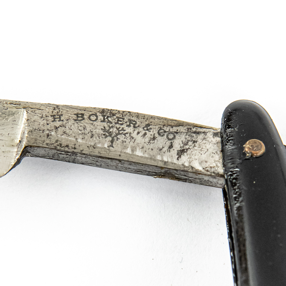 Vintage Straight Razor by H. Boker & Co, with black plastic scales. The face is blank, Tang reads “H. Boker & Co” w/ tree logo, and reverse reads “Germany” Blade is in overall great condition, with nice luster, minor tarnish near tang, has cosmoline protectant applied. Original box IS included and is in fair-to-good condition, with signs of age like fading and stains noted. See photos and bid accordingly.