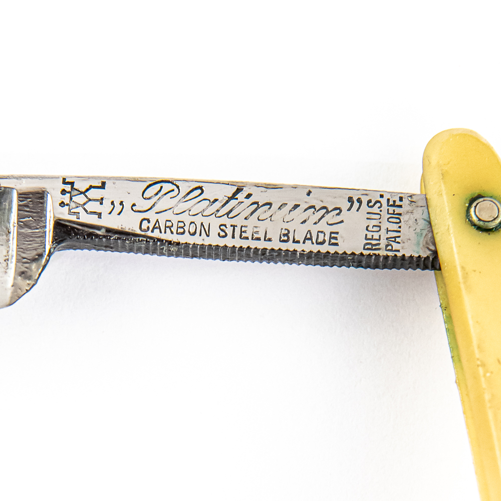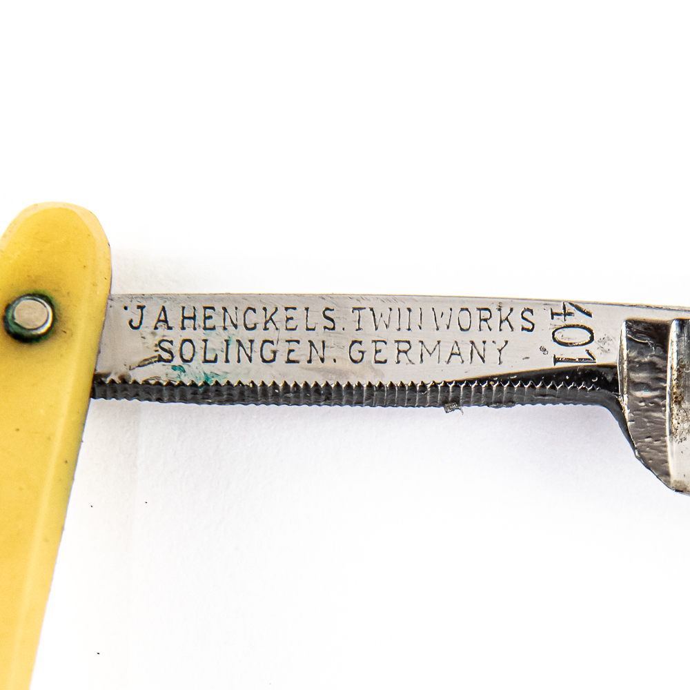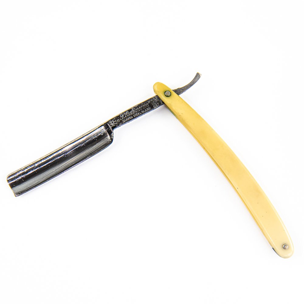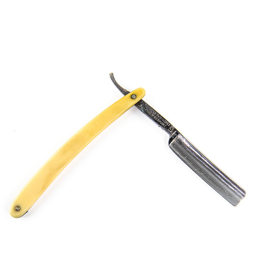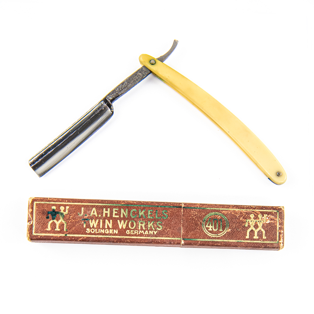 Vintage Straight Razor by J. A. Henckels, with off-white plastic scales, minor corrosion noted near pivot-pin. The face is blank, Tang reads “Platinum Carbon Steel”, and reverse reads “J. A. Henckels Twinworks Solingen Germany 401”. Blade is in overall great condition, with shiny luster, has cosmoline protectant applied. Original box IS included and is in fair condition, staining and edge wear noted. See photos and bid accordingly.
