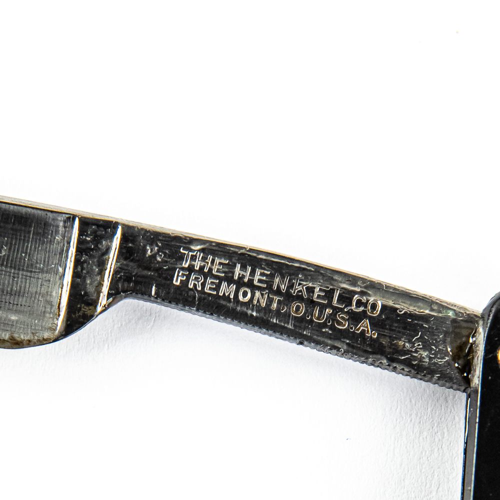 Vintage Straight Razor by The Henkel Co, with black plastic scales. The face is blank, Tang reads “The Henkel Co Fremont, O U.S.A.”, and reverse is blank. Blade is in overall fair condition, with nice luster, but spotty rust noted, has cosmoline protectant applied. “J. A. Henckels Zwillengswerk Ag Solingen” plastic box included and is in fair condition, fading noted and cracks near cap. See photos and bid accordingly.
