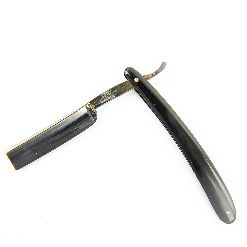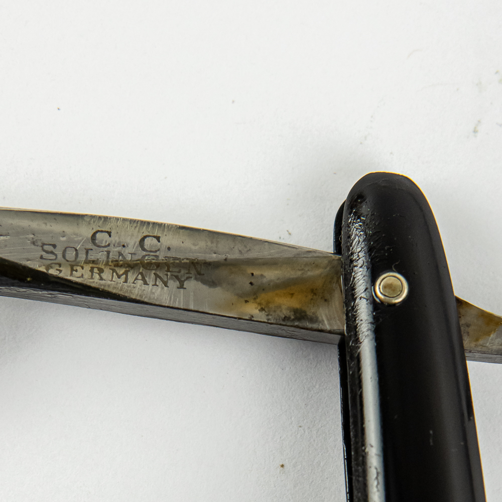 Vintage Straight Razor by C. C. Solingen, with black plastic scales. The face is blank, Tang reads “C. C. Solingen Germany”, and reverse is blank. Blade is in overall great condition, with shiny luster and minimal spots/tarnish, has cosmoline protectant applied. Unoriginal box IS included and is in fair condition. See photos and bid accordingly.