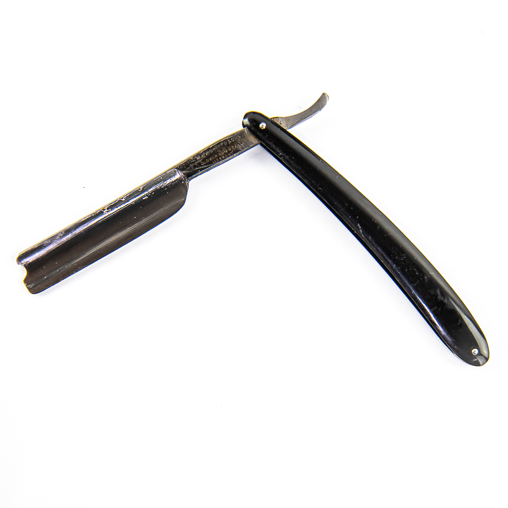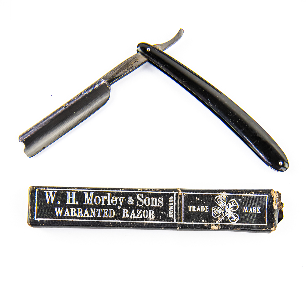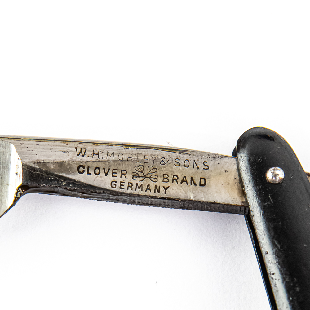 Vintage Straight Razor by W. H. Morley & Sons, with black plastic scales. The face is blank, Tang reads “W. H. Morley & Sons Clover Brand Germany” w/ logo, and reverse is blank. Blade is in overall great condition, with nice luster, has cosmoline protectant applied. Original box IS included and is in fair condition, damage on cap noted. See photos and bid accordingly.
