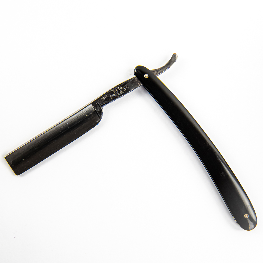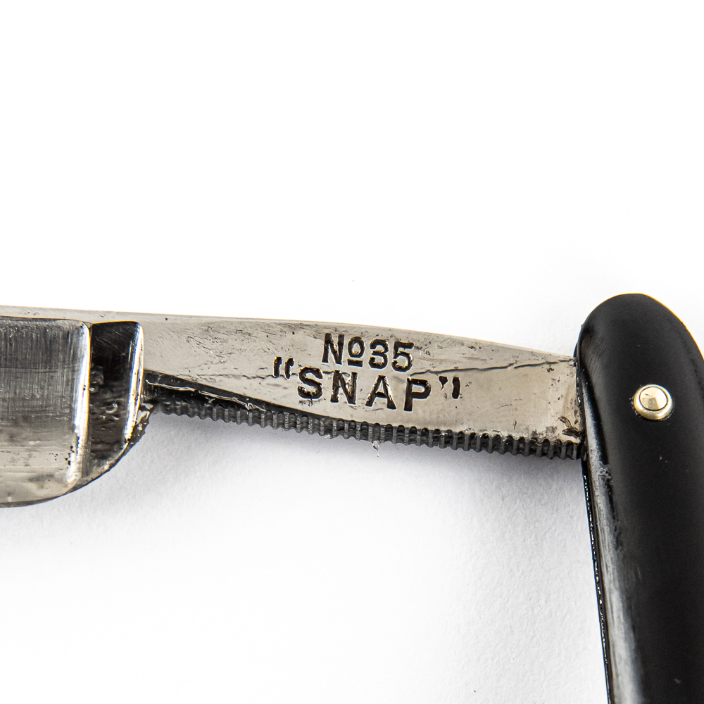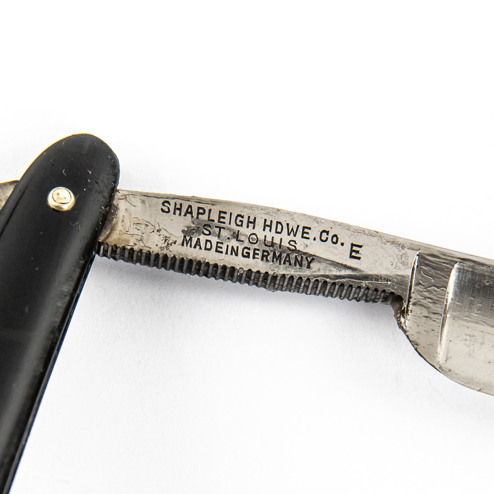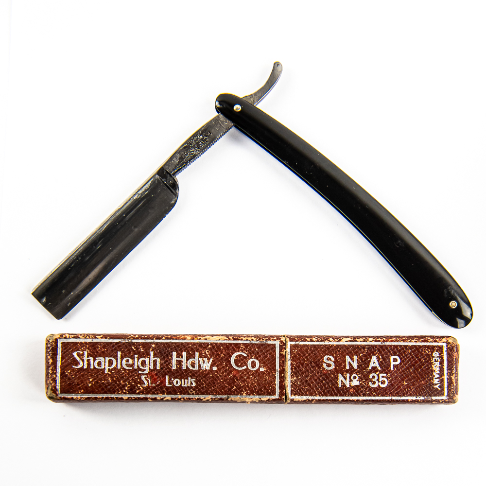 Vintage Straight Razor “No 35 Snap”, with black plastic scales. The face is blank, Tang reads “No. 35 “Snap” “, and reverse reads “Shapleigh Hdwe Co. St Louis Made in Germany” w/ an “E”. Blade is in overall great condition, with nice luster and minimal tarnish, has cosmoline protectant applied. Original box IS included and is in good condition, minor edge wear and fading noted. See photos and bid accordingly.