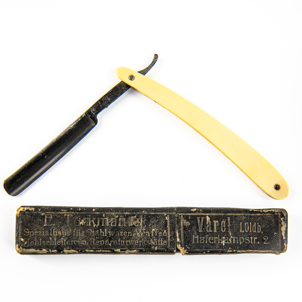 Vintage Straight Razor by E. Tuckmantel, with off-white celluloid scales. The face is blank, Tang reads “E. Tuckmantel Solingen Varel”, and reverse has a circular logo. Blade is in overall good condition, with nice luster and minimal tarnish, has cosmoline protectant applied. Original box IS included and is in poor condition. See photos and bid accordingly.