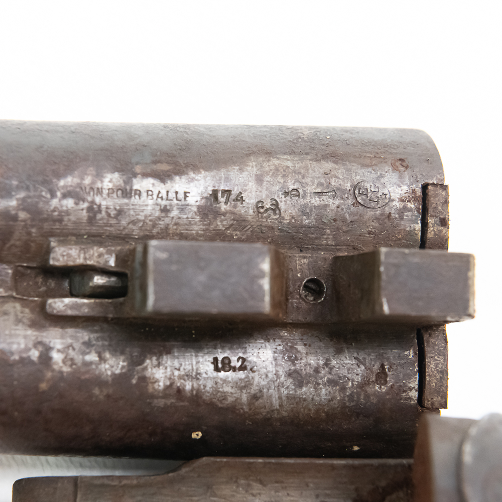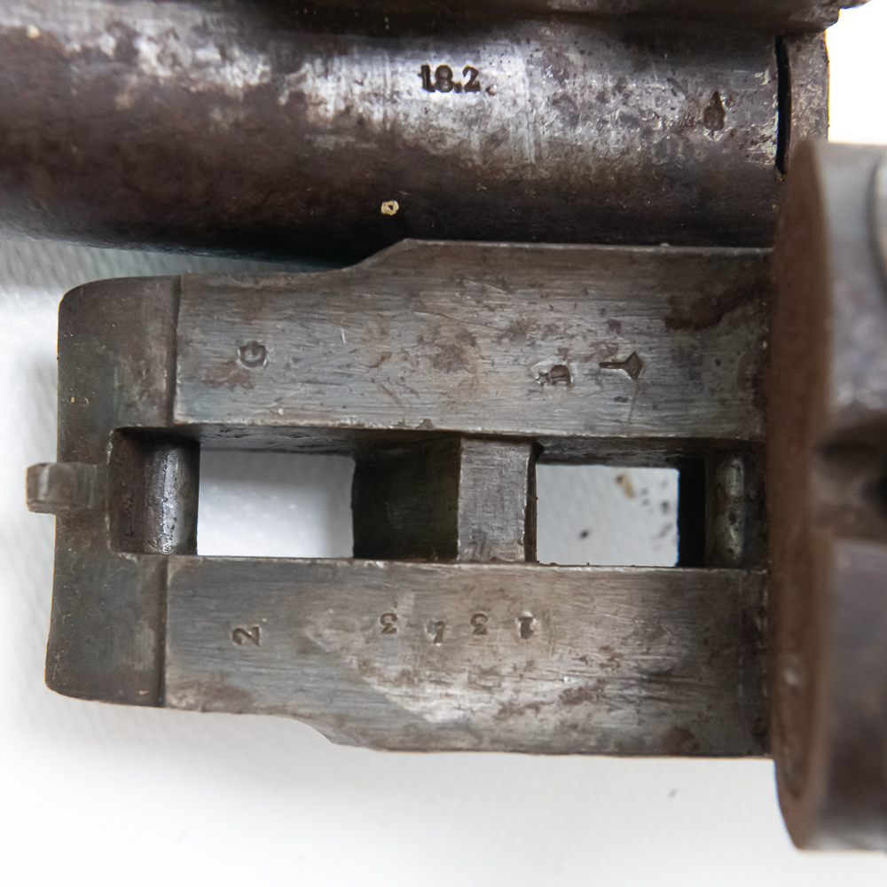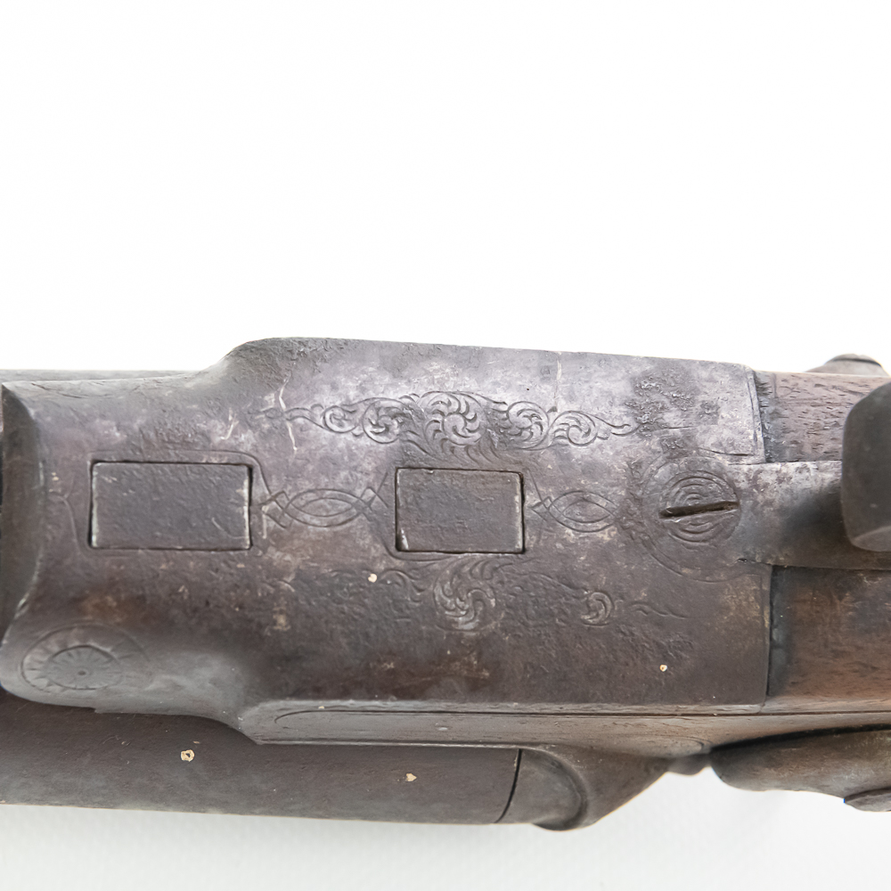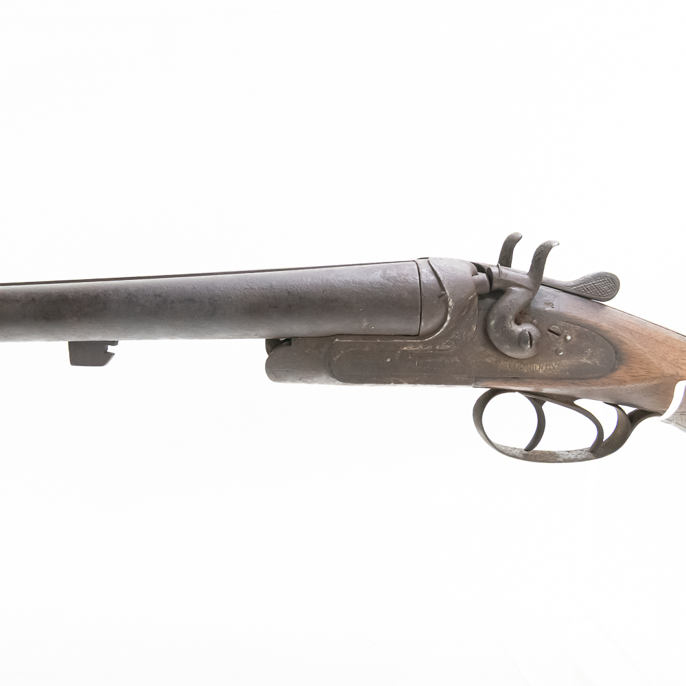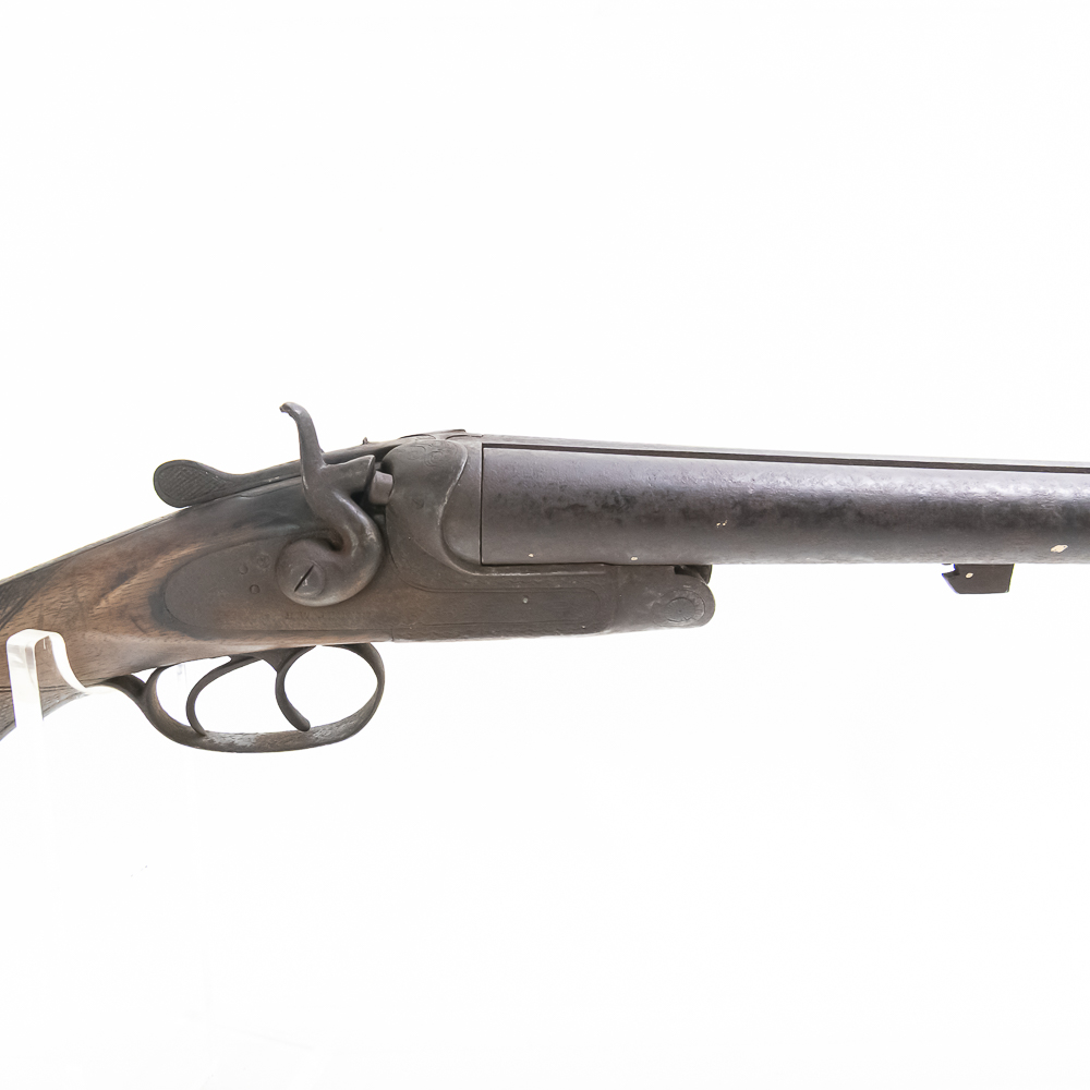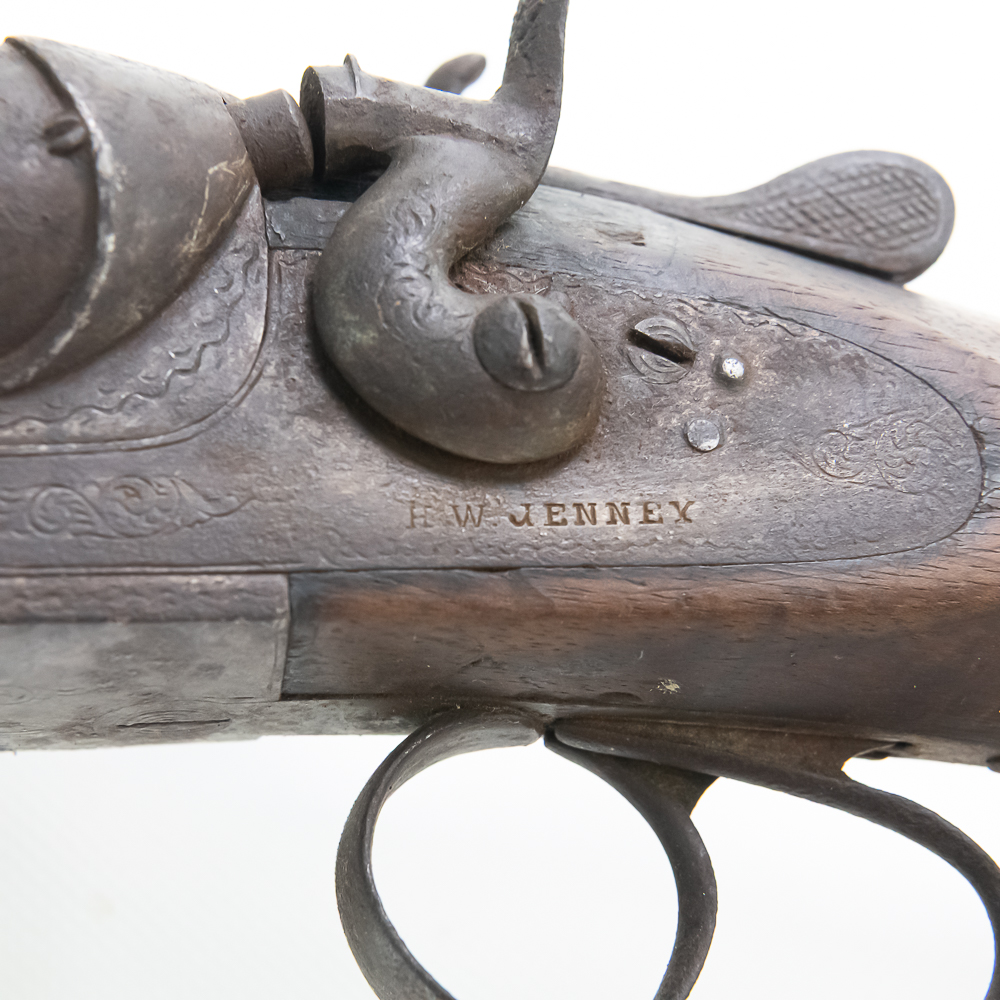 HW Jenney SxS 12g Shotgun in fair to poor condition with heavy wear and oxidation. The forearm is missing and the action is loose. The bores are dark. C&R Eligible S/N:1313